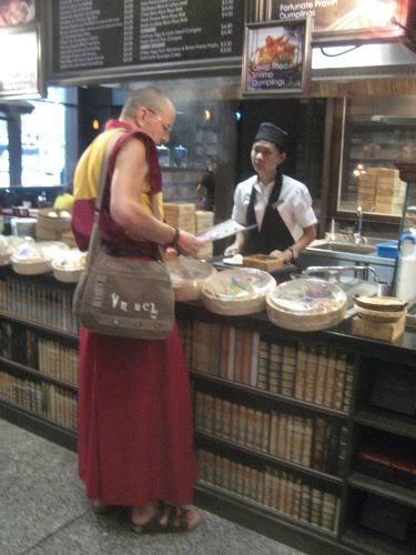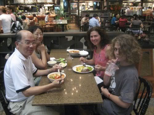 After some window-shopping we went to a very upscale food court filled with Singaporean food stalls.. It looked and smelled delicious. Lucy and Lip helped us locate some really amazing local specialties.. I had a spicy noodle dish with fish and vegetables (I’m not doing the vegan thing on this trip.. too hard) . Gabe had a chicken and pork barbeque-y thing.. and Diane had sour-gourds on rice.. All were yummy…