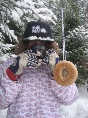 We got to the tree and laid out our goodies and proceeded to decorate. Gabe developed a cool way of hanging bagels and donuts.. You tie two together and through it like a bolo. Works every time !