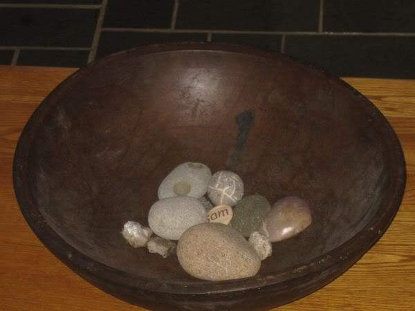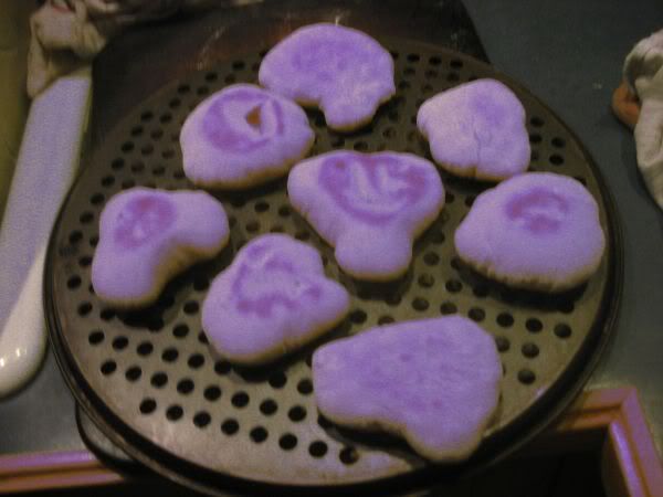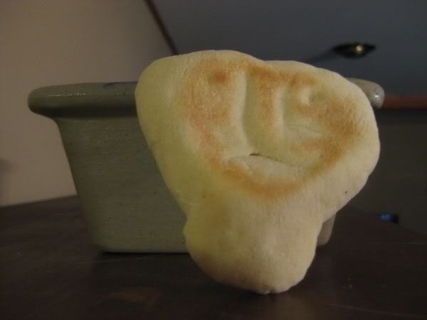 We got home around 2 and just hung out the reast of the day.. I wrestled a little with the motor controllers which continued to vex me.. and when that didn’t work.. I decided to sit and do nothing.. something that I worked hard to learn to do on the colony.. I finally managed to do nothing for abotu an hour.. While I was doing that.. diane was prepparing food for the vegitarian potluck we were attending tonight. Her contribution was home made hummus and home made pita breaad.. When she pulled out the 2nd batch of pita.. this is what she saw.. Do you see the face in the middle pita ?!