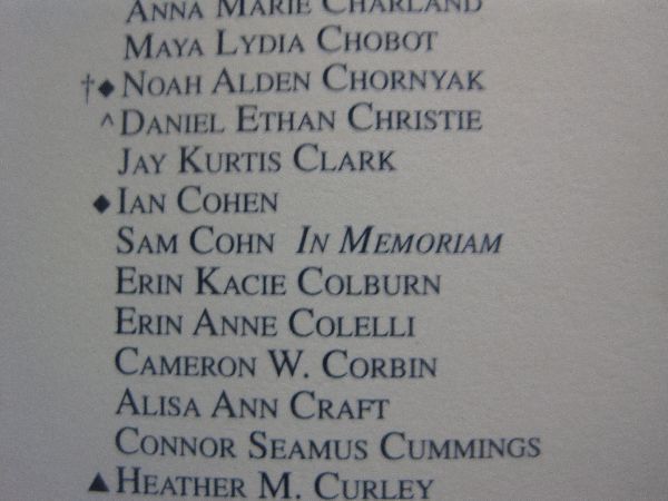 Diane and I got there a little early and found some time to talk to friends. We picked up a program and were surprised and grateful to see Sam’s name in there.. Listed in memoriam .