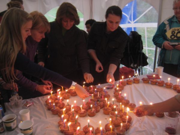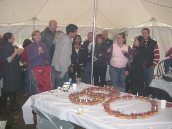 here;s the cake.. 80 cupcakes.. took lots of folks to light it !