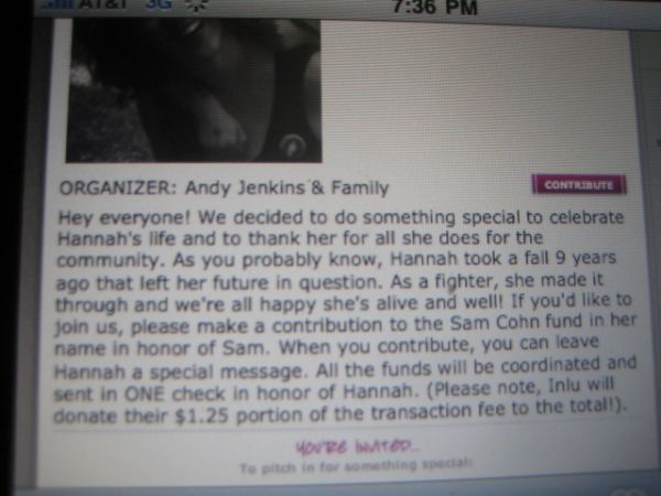www.inlu.com . You use it to organize group gifts.. and the gifts can be charitable. Andy and Jamaica set up an Inlu donation in honor of Hannah’s recovery to the Sam Cohn Foundation. It’s such a cool idea.. I’ll send out a link to the donation site as soon as I can find it.