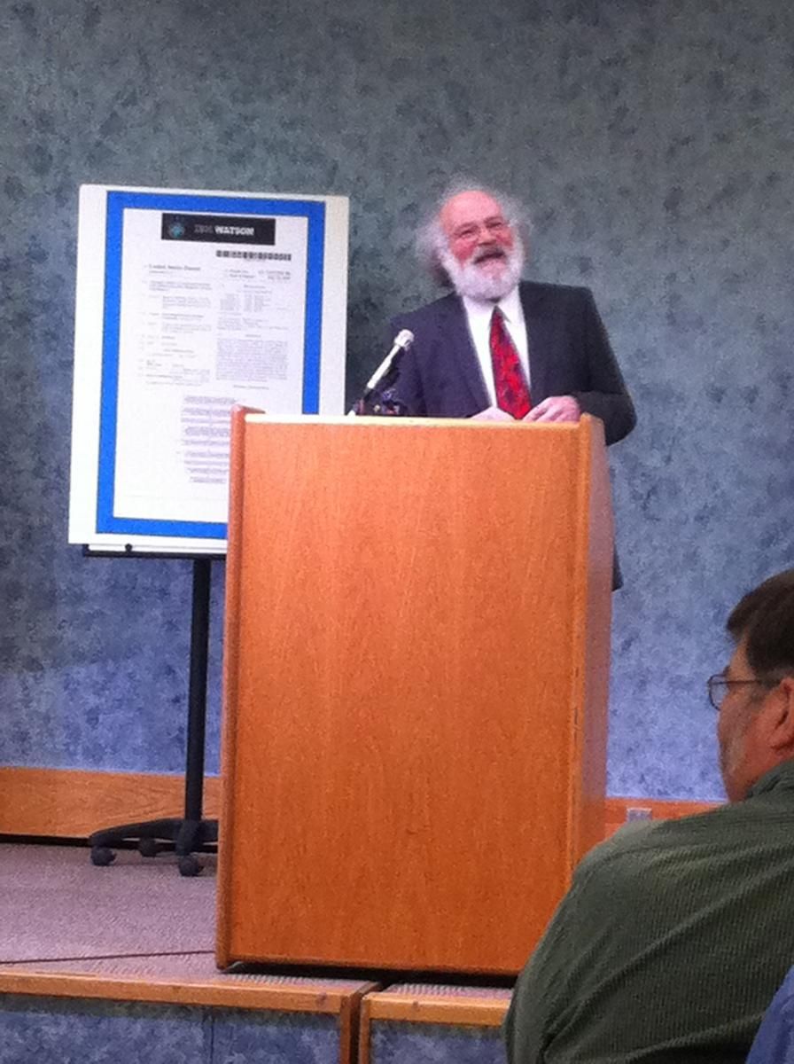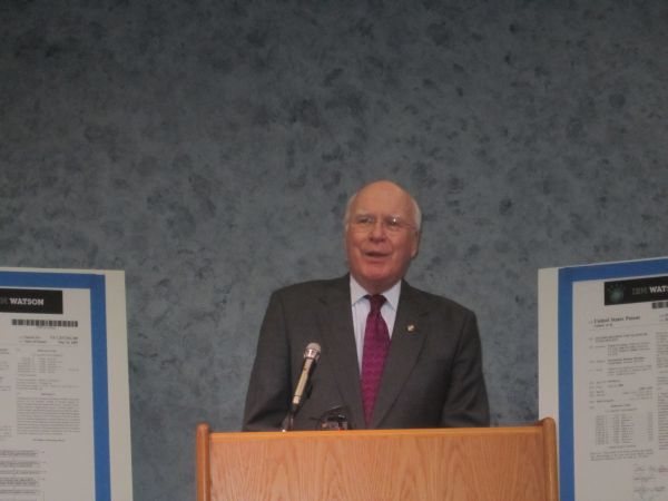 Just sitting down to write.. It’s just past 2AM and I keep falling asleep as I type Good day today.. the main even was a great visit to the site by Senator Pat Leahy and his wife Marcelle. I had the honor of doing a short presentation for the senator and about 200 of my co-workers. My task was to link IBM’s recent Watson victory on Jeopardy to the patent contributions of some of my Burlington-based coworkers.. It wasn’t hard to do.. Burlington had help drive at least 20 patents that were used in the creation of watson.
