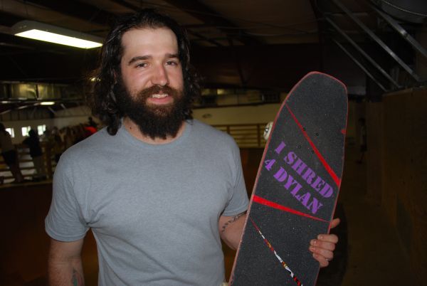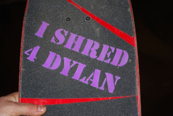 Still.. it was a very happy and upbeat event.. there were tons of folks tere.. Phil came by with Morgan and son James. Phil had made some ‘I skate for Dylan’ stencils and made soem cool grip tape.. he even spray painted his own kid !.