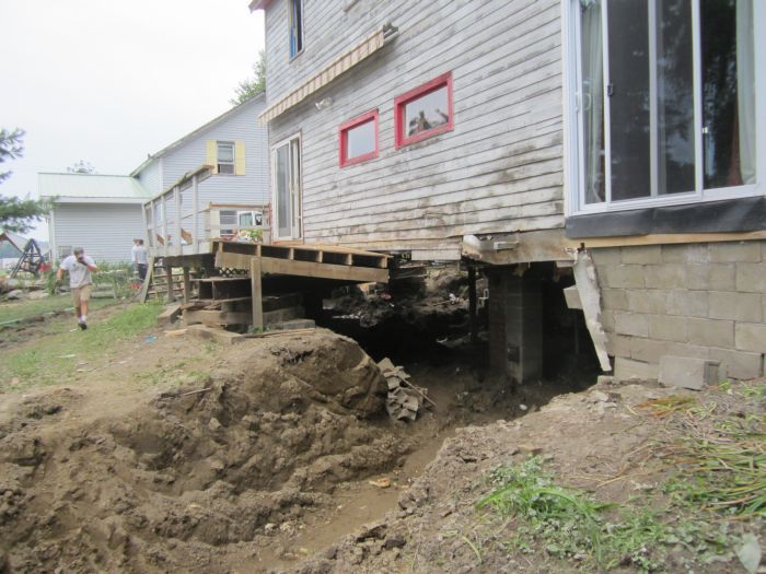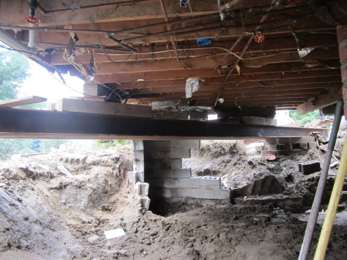over the last couple of days townsfolk have come in with house jacks, girders, backhoes, shovels and buckets to shore up and save both houses.. first they stuck in big steel girders, then they gently lifted the houses then shimmed up the girders to level the houses.. Then folks started digging the silt out of the ruined basements. Next week they will pur new concrete walls to replace the cinderblock walls that collapsed.