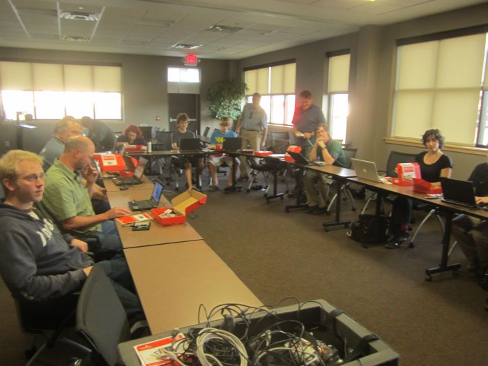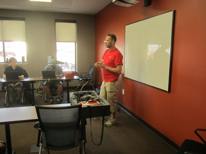 With all the excitement about the Mr Cougar event last night, I did not get a chance to talk abotu the other event that I went to earlier in the evening. It was the 4th event held by the Vermont Makers. Last night’s event was an Arduino workshop by SprarkFun‘s Jeff Branson. I wasn’t able to stay for the workshop, but I was able to come by and meet up with everyone before the event. Jeff had driven all the way from Sparkfun’s home base in Bolder Colorado to give this and many similar classes around the north east. Jeff’s entire job is to spread geekiness in the name of getting people to have more fun with electronics and invention. Sparkfun is one of those companies that does well by doing good. they run free soldering workshops at makerfairs, sponsor robotic competitions, and give away 100’s of thousands of dollars of stuff to folks (like me) all over the world in the getting folks to let their geek shine.