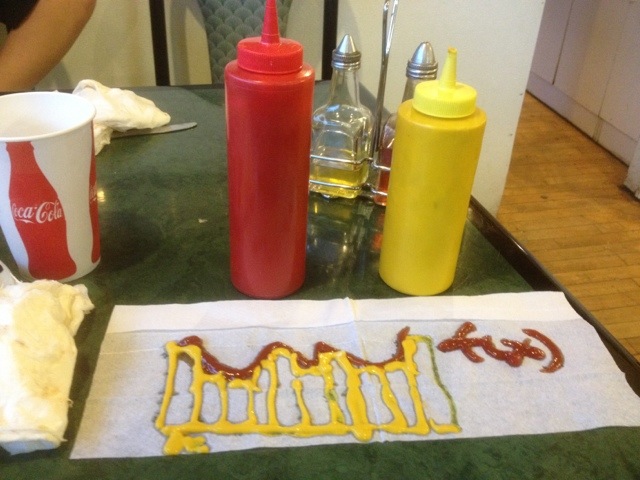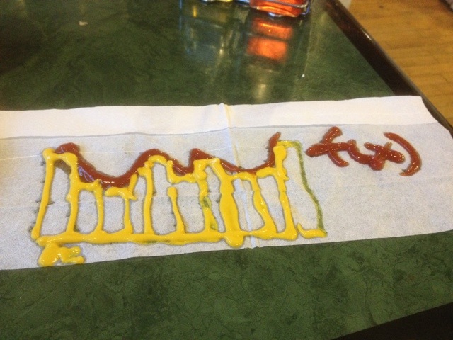 Gabe and i just came back from a yummy dinner at bridge street after each of our respective long days.. It was great hanging out with gabe and talking. We got on the topic of calculus… There was no blackboard around.. So i picked up the closest thing.. A napkin and the squirt bottles of ketchup and mustard. I did my best to describe Reimann sum integration and derivatives using the condiments.. Not sure the waitress (our friend lauren) relished it much ….yuck yuck yuck
