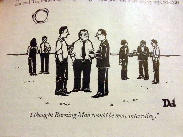One thing I did reflect on s that today was the temple burn at Burning Man..While I had hoped to be there this year, I had too much stuff going with work to make it happen. I’m not that sad to have missed it..I think I need to adjust my thinking and plan on doing it every several years. a visit there can last you for several years i think.. It was funny. Burning man was very much on my mind when I ran across this cartoon in this week’s New Yorker..