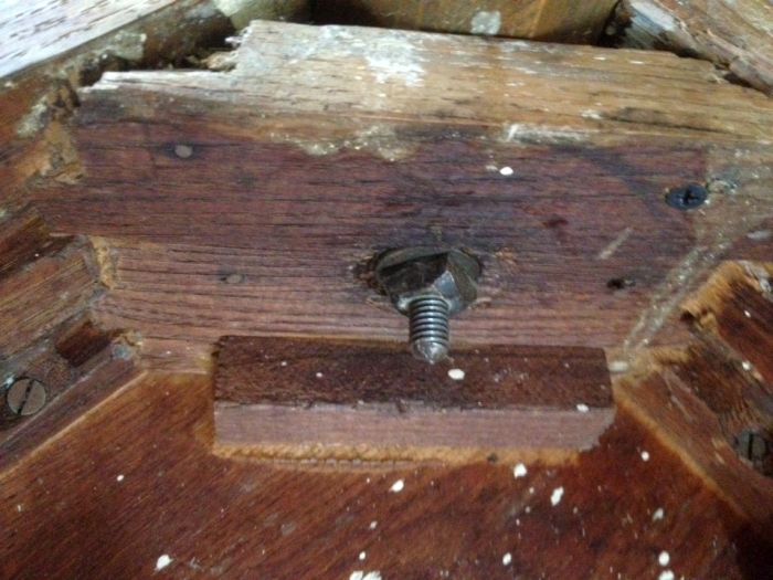 the source of the porblem was the old 19 century hardware.. no threads left… I assisted with a little 21st sentory deck screes.. mybe not enhancing the value of the table as an antique.. but definitely adding to its utility..