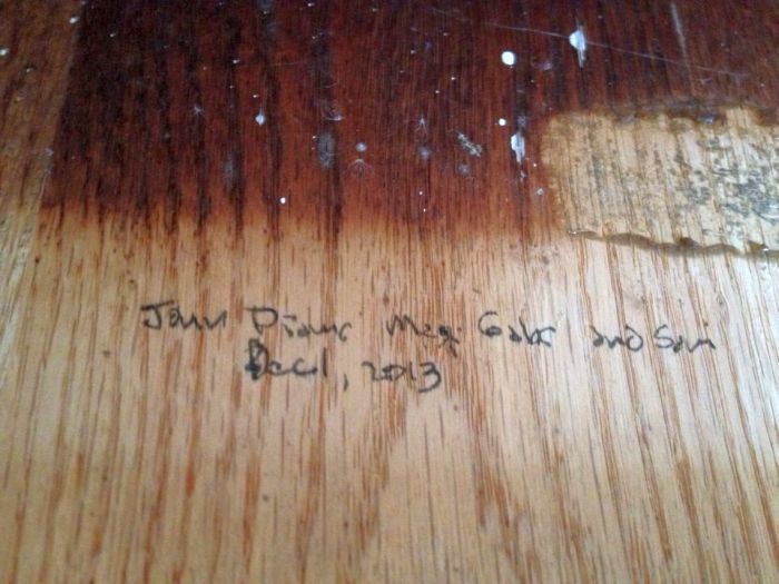 I unscrewed the table from the frame.. while I was there.. I put a little reminder to the next person who takes it apart.. ‘we were all here’.. at least in spirit.