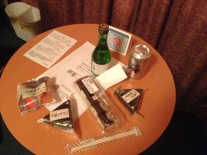 As always.. i don’t like eating ot alone, so I wen tbyy the 7-11 an picked up some onigirm sushi and some sake,,