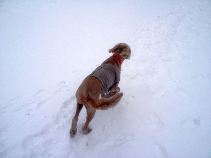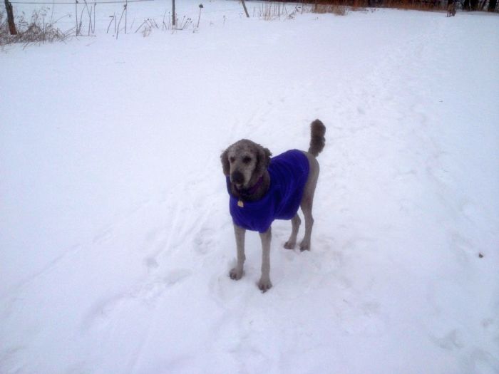 We did get out for a short walk on the ice with diane , jane and the dogs. They both had gotten clipped while I was in Nevada.. the single digit weather called for creative measures. Diane offered up two of her vests.. they looked sweet !