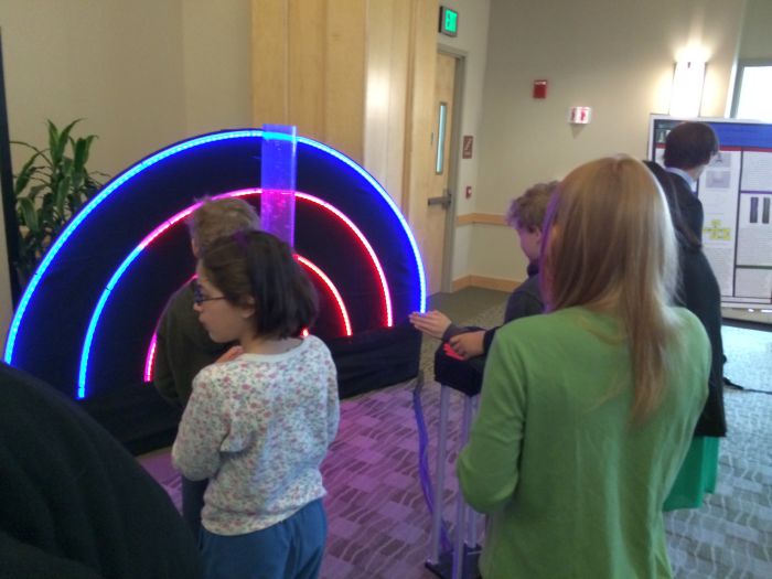 Bill G and I have been mentoring this team on a fun bubble column project for ECHO. The device they built is a model of what we might one day do for the bubble column at ECHO. It’s been an adventure.. lots of design changes.. lots of new stuff to learn.. and it all came together at the last minute. Literally.. Mona was fixing the last code bugs at 2:45 just as they had to move the device over to the Davis center. The device reads the position of both your hands and uses that to modulate the position of lights.. that represent the lights in ECHO’s ceiling. When you balance the positions just right, the bubbles stop for a bit and you’re rewarded with a cool light pattern. Simple and elegant.