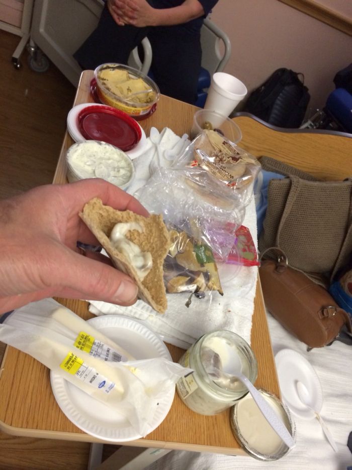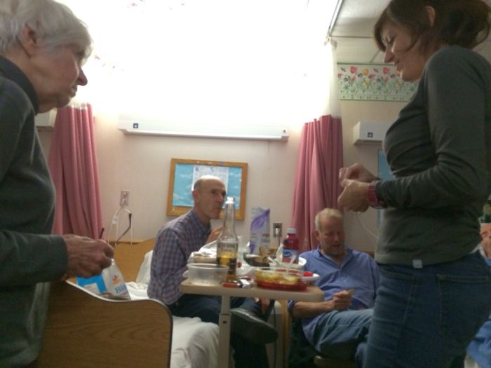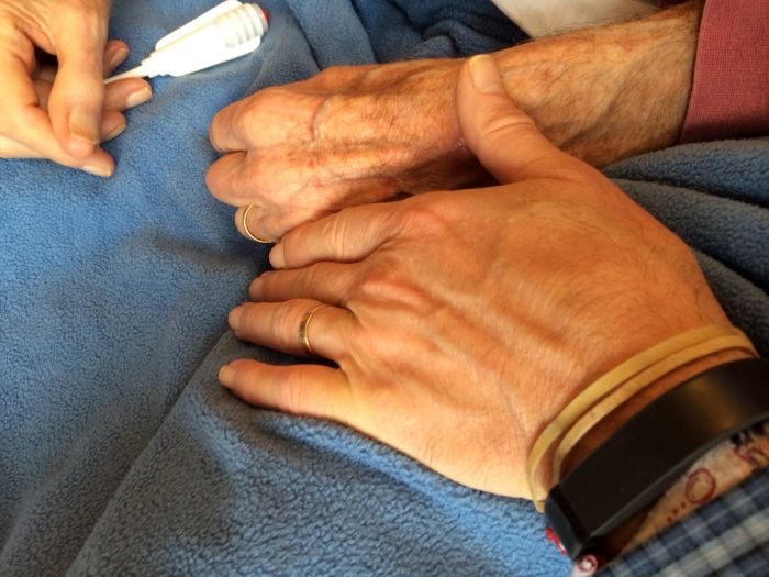 Dad is resting now.. going deeper and deeper to sleep. All day we’ve been here sitting, watching, talking.. we even had a small party of sort. we have a pile of snacks (‘pu-pu’s dad called them).. spread out (cheese, hummus, creamed herring, sardines, olives, tzaziki, pita) and a bottle of Patron tequila. Sam and Martha were here for awhile and billy entertained us all.. felt good to laugh a little. Now it’s just quiet while we hang out and wait..