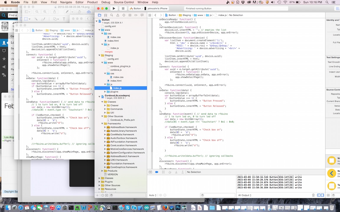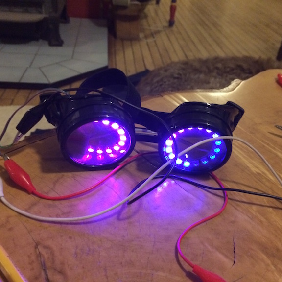 I had a great maker day today.. I spent the day creating a pair of bluetooth controlled light up goggles. I bought a ‘kit’ of sorts form adafruit that came with two LED rings and some funky burning man like goggles. It was designed to be used with an arduino ‘trinket’ a vow cost arduino clone. I want this to be cell phone connected, so I created my own code for an rfduino chip that has a built in bluetooth low power radio Then I created a simple IOS app using Cordova.. Not much yet.. but I can turn the goggles on and off and control them from the phone.. Fun !