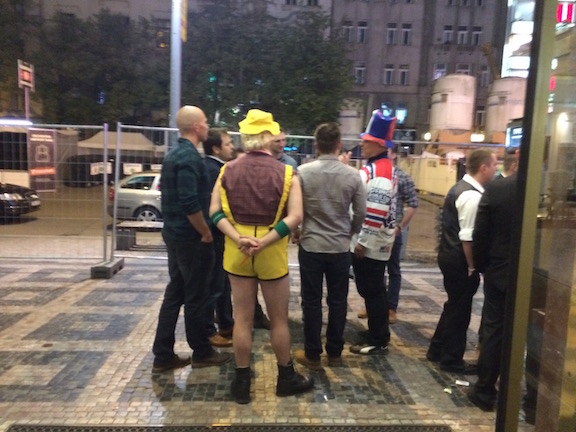 then sat around and admitted the crowd.. THere’s lots going on here now.. Theirs Hockey’s world cup.. and tomorrow the prague marathon.. so no end of colorful characters on the street.. even at midnight when I took this picture..