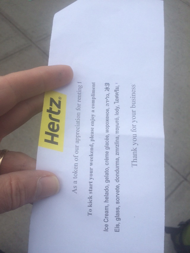Home … home.. home !.. After a grueling but fin week in the middle east and Armonk.. home for 36 hours then off to asia again. My head was swimming by the time I got to JFK. I checked in my car and was surprised to receive a voucher for a free ice cream cone !. It was customer appreciation day at hertz.. how cool is that ?
