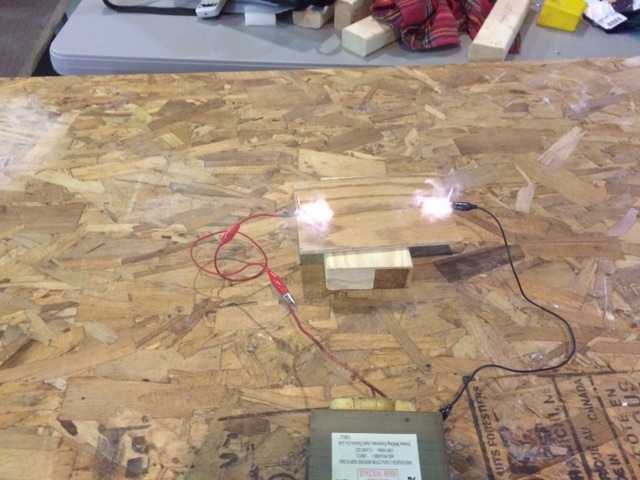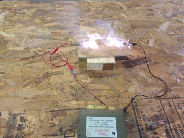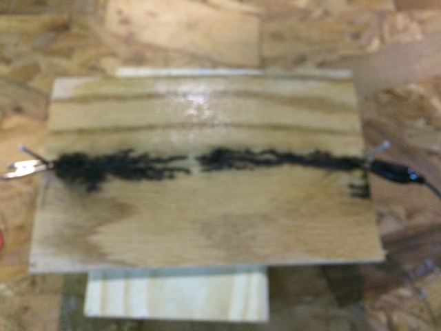 We decided to try an expereimentI’ve wanted to try for a long time.. We took the transformer from an old microwave (DANGEROUS !!!) .. then hooked it to a piece of wood that had been wiped with a solution of backing soda.. this is what we got !