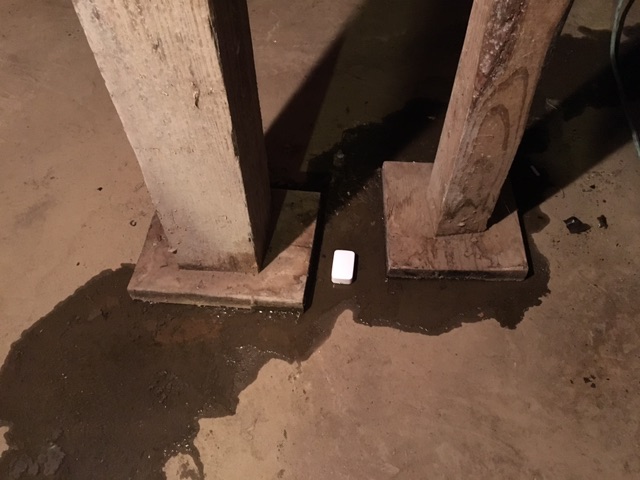 I cleared out the stairs and went down into the basement.. and sure enough.. my smart things leak sensor had a light that said ‘help.. I’m in water’ .. and there was water on the floor.. it had been raining all day and some must have leaked in through the dirt.. bummer
