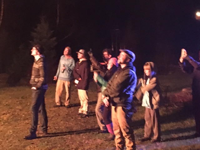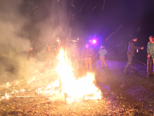 Chris had planned a bigger event.. but decided to delay that until early Jan.. tonight’s burn was of a single cadle.. there were about 20 folks there braving the marshy back yard