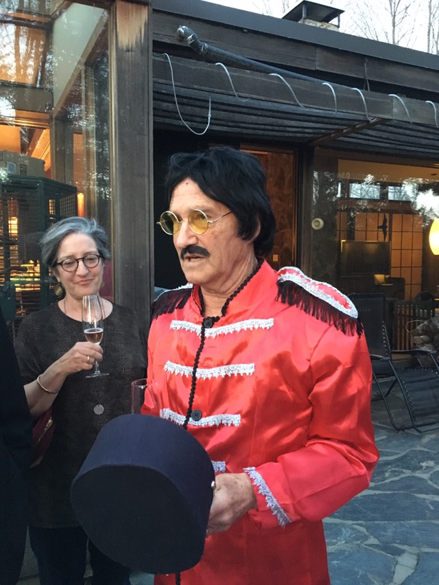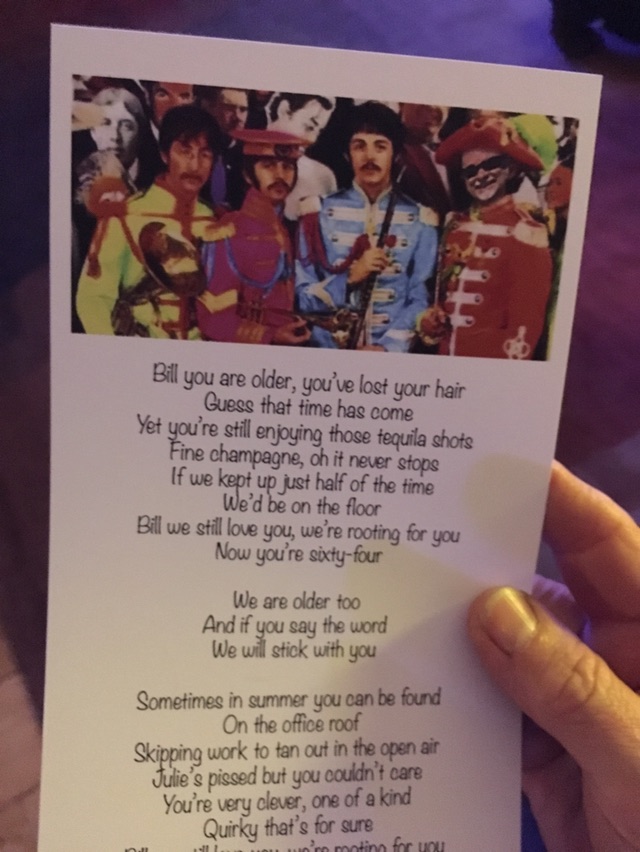 Just past midnight and we’re just back from Bill and Julies down in Watsfield. It was Bill’s 64th birthday.. Julie threw him a great birthday party .. we al came in Sargent Peppers outfits.. It was very funny and very fun.