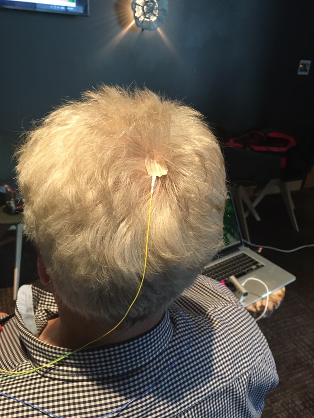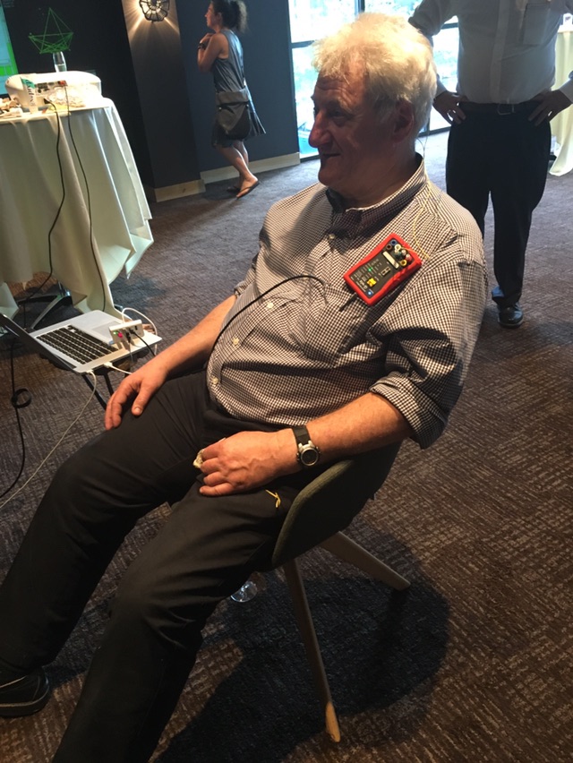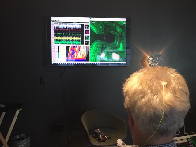 one highpoint was a visit to frind Bob’s ‘brain hacking’ eventat hotel VT. diane and I slid in ner the end and saw all the equipment that Bob and his freind Kyle had brought witht hem Very impressive. Here we see our freind herb hooked up to an EEG thats being used to drive a video gamee.. cute !