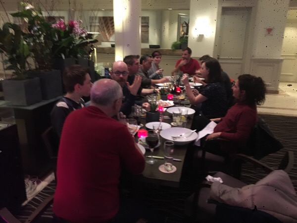 Around 8:30 we decided to head out for dinner . The sushi place was full so we all ended up at our hotel . Work party turned into dinner party