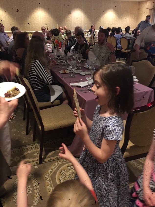 this kid found the aufekomen.. the hidden third peice of matzoh which means she wins somen prize.. not sure what.