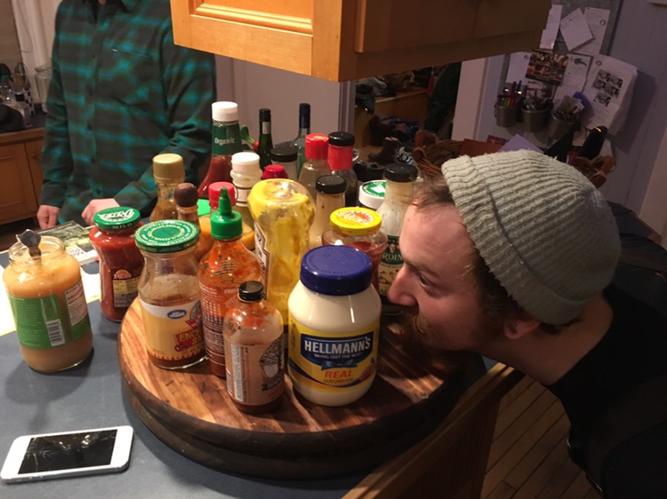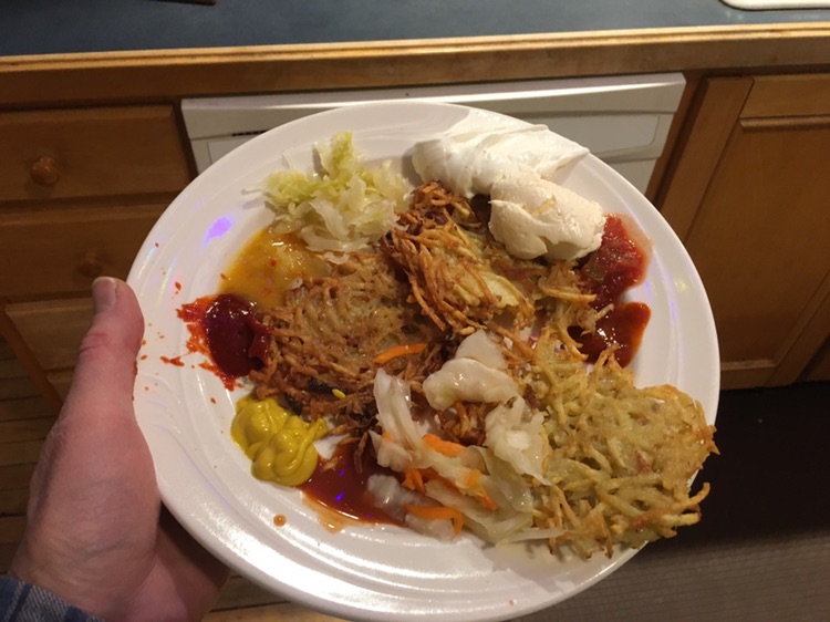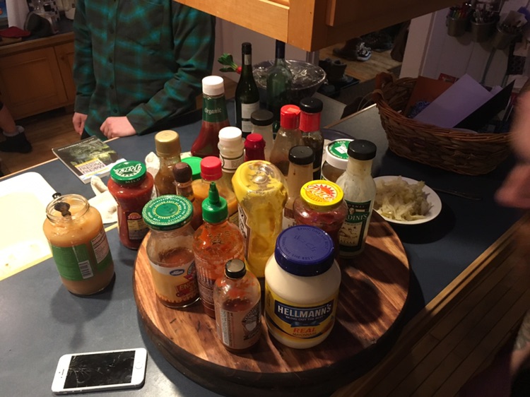 I was responsible for the condiments.. traditionally it’s just sour cream and apple sauce.. but in our house we add mustard, kim chi, peanut sauce, chipotle chalula, pace hotsauce, sirracha, may, enchilada sauce. Caesar dressing sauerkraut.. I tried them all !