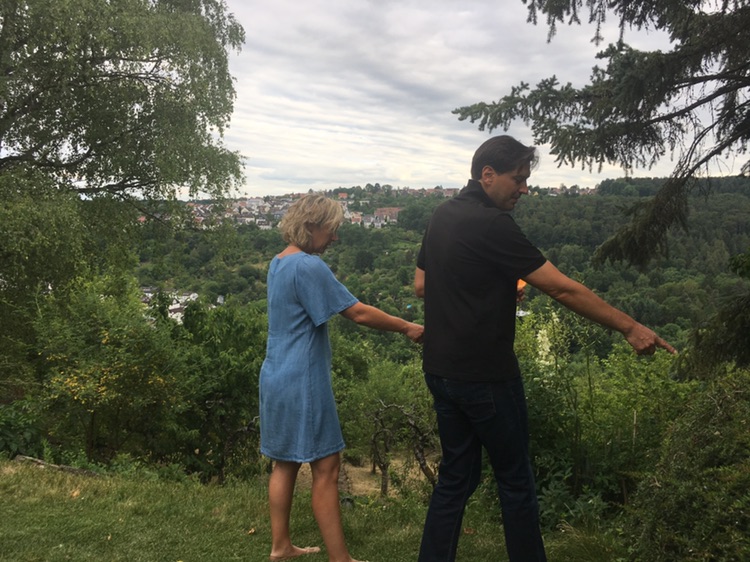 here katja and florian are pointing out plants in teh garden (Yuccas in Germany !)