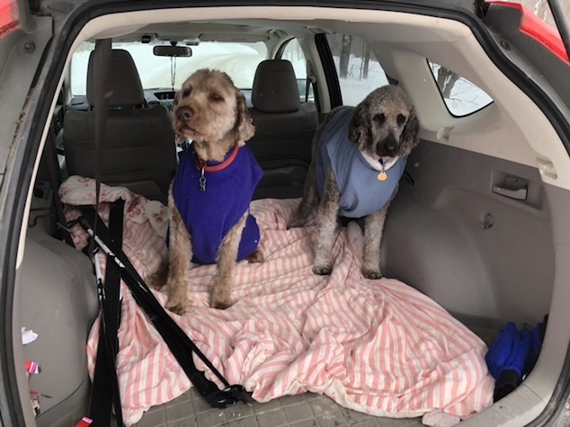 We were committed to get out in the snow today.. first we triedd takign the girls up to the sugar shack trail on bolton.. but it hadn’t been plowed and there was at least 3 feet of snow in the lot.. so we headed back to the notch rode to try libbys lookout.. the girls were not thriled with the weather. it was 10 degrees F and blowing about 20 mph.. it was freeing. they made it about 100 yards in and both started having trouble keeping their paws on the ground. We had to give up and take them home.