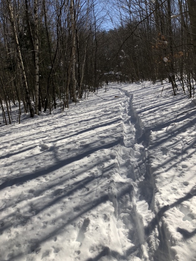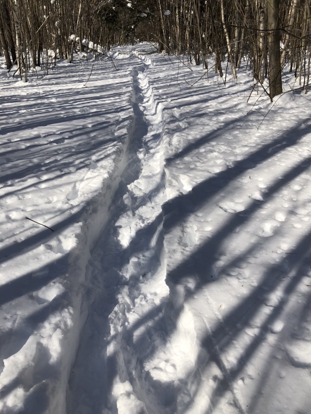 last night. THe dogs revolted and woulnd’t hike.. so we brought them home and went back on our own. We followed our own tracks from yesterday up the hill. it was slow going in all that snow.. still more than 2 feet deep. . I made a point of steppign on the places I’d missed yesterday in order to better smooth the trail for the next folks coming through.