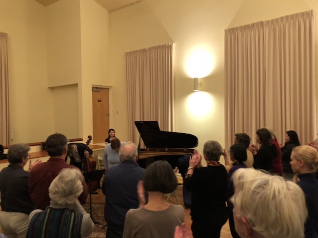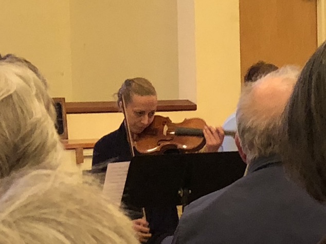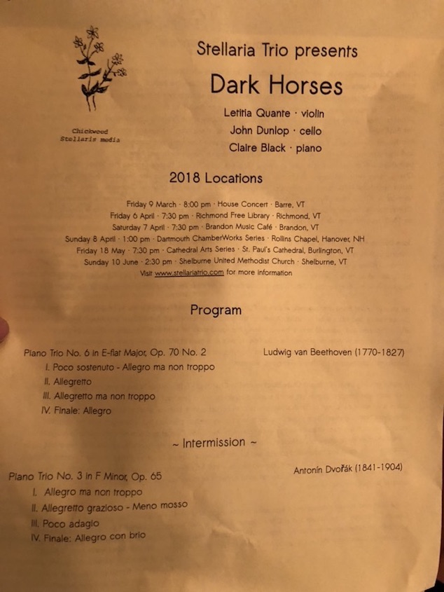 I had to stop at 5:30 to welcome friends.. Tonight we went to a concert at the Richmond Free Library.. Our friend Letitia (Lucy’s daughter) played a concert with her Stellaria Trio . Stelaria I just learned is the genus of the Chickweed family.