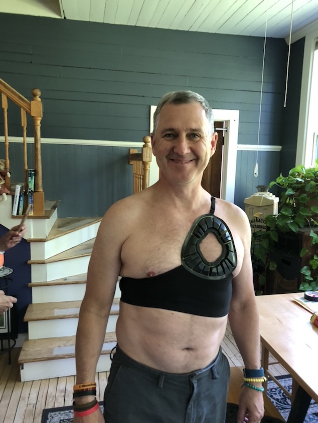 Storm’s working through the tough treatments and is feeling strong enough to play baseball for CVU highschool. One of the challenges is that Storm has a chemo port implanted on his chest that needs protecting when he plays. . Lyn.. who’s an amazing seamstress and I have designed a protection device to protect the port while he pitches , runs, etc. We call it the S-port (get it ? ).. I made a diamond shaped polycaprolactone. (a polyester) shield that I molded and drilled to fit a flexible hip impact protector for snow boarders that Matt and Julietta got at Burton . Lyn who used to work at Jogbra created a lycra belt and strapping device to hold the pad and sheld against Storms body.
