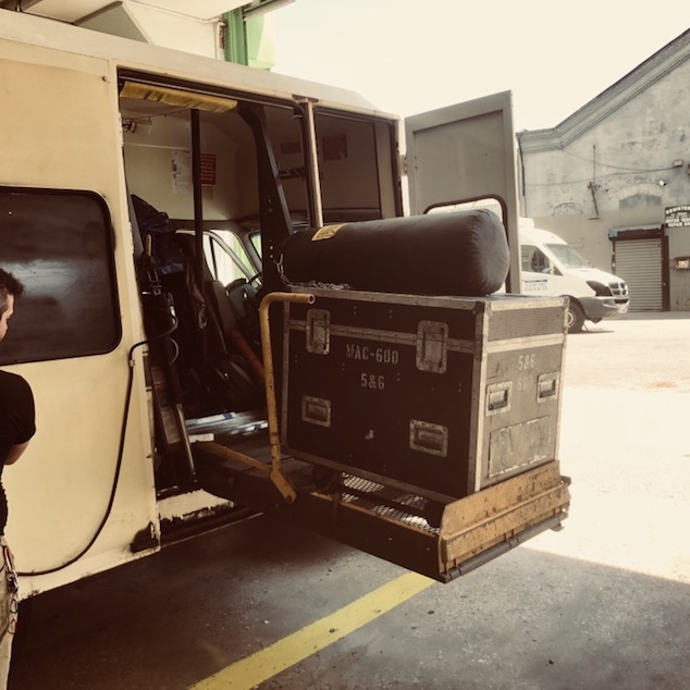 luckily max and becky have an old van with a handicap lift.. just the thing when you’re lifting a 200 pound case with theatric lights