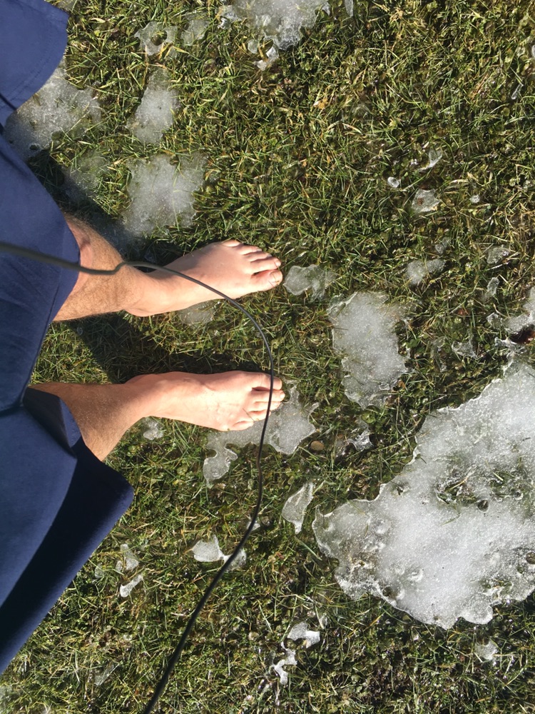 I took some of my calls outside just to soak up the unusual spring like weather .. the grounds still frozen..a nd there’s still snow.. but it was time for shorts and barefeet !