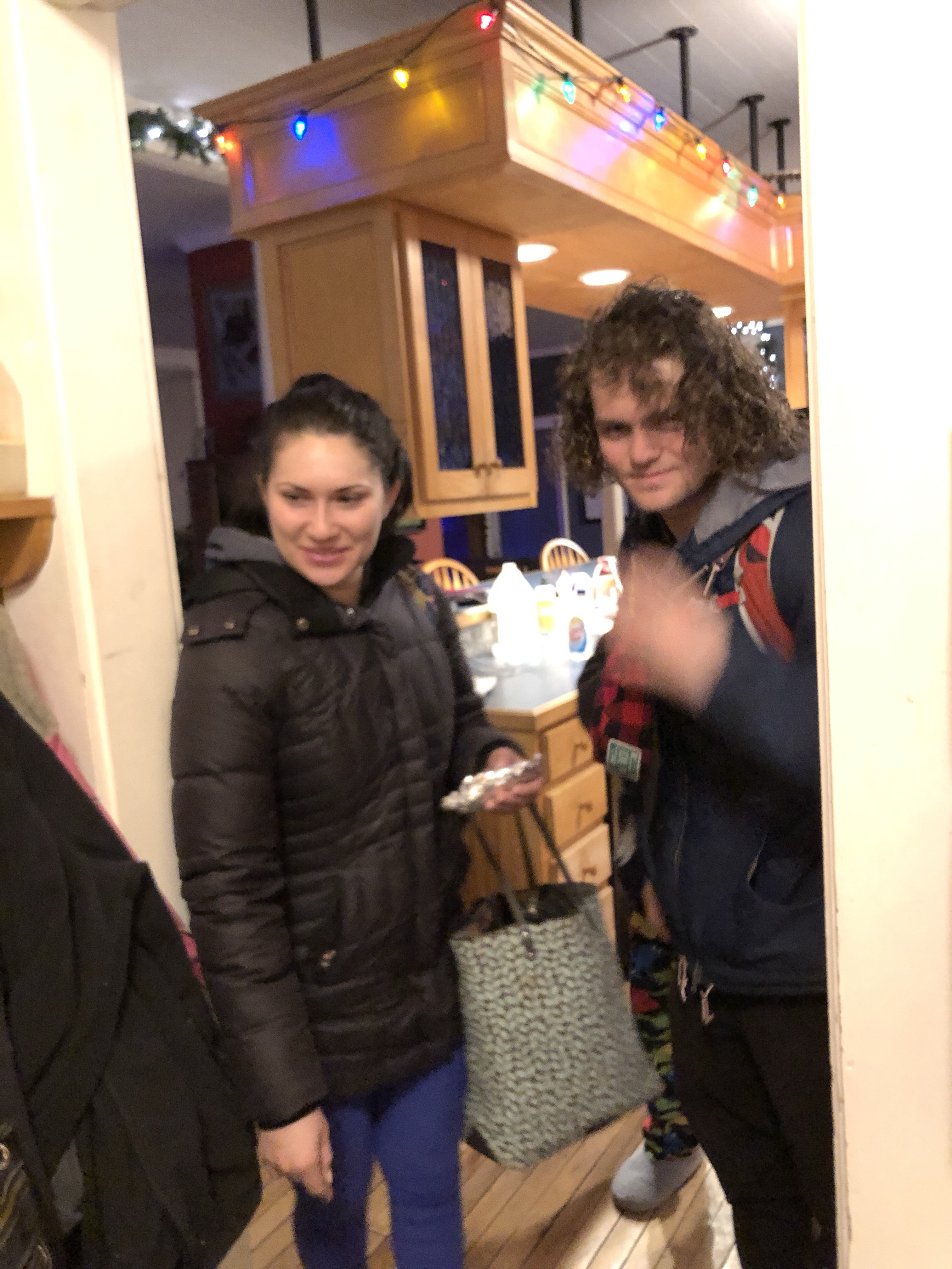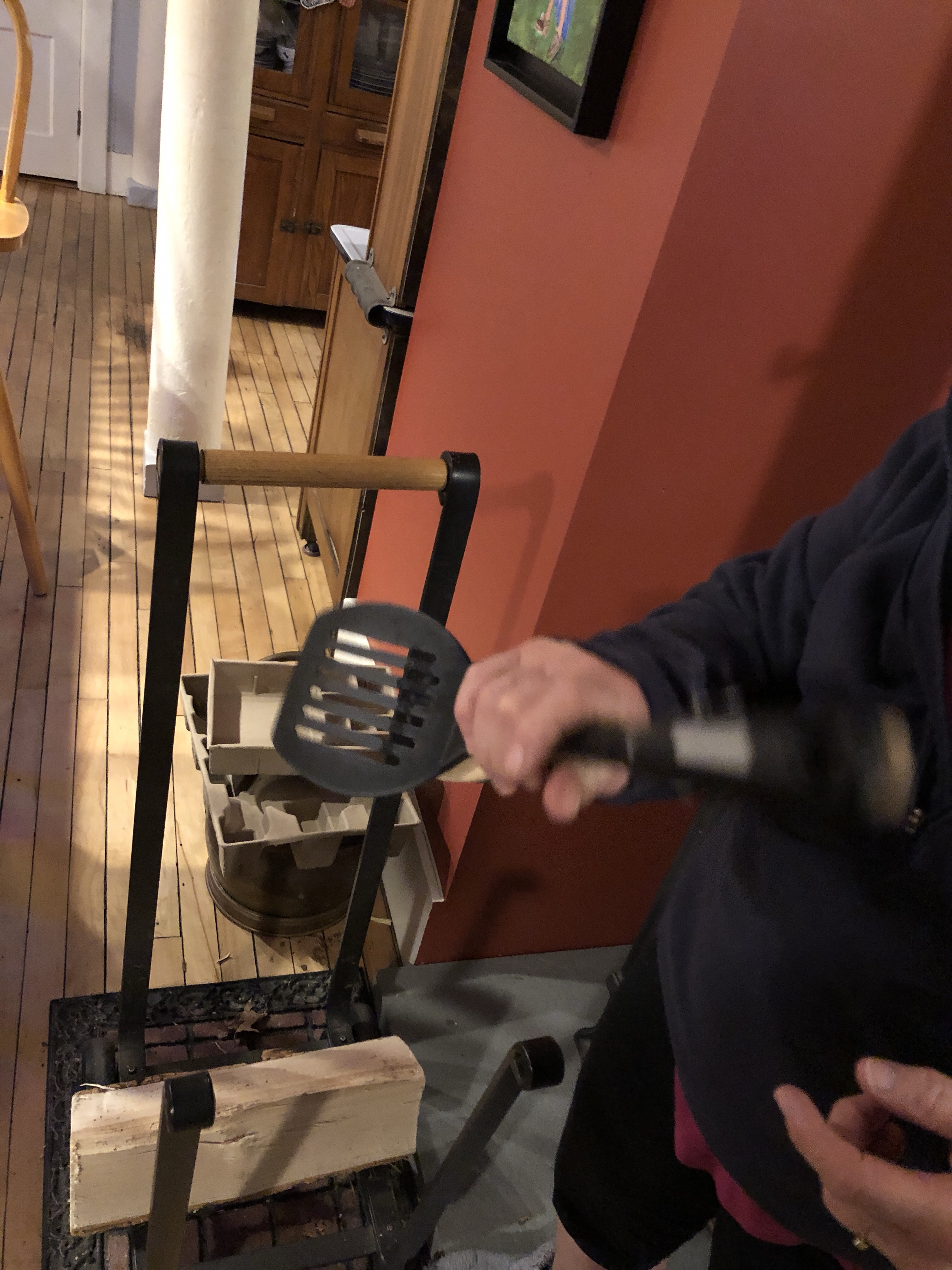later tonight we had dinner with new roomy Eliot. He gave us a demo of the tool he bought for wire tying his maple sap lines . We had him demonstrate on a wad of kitchen utensils.. impressive!