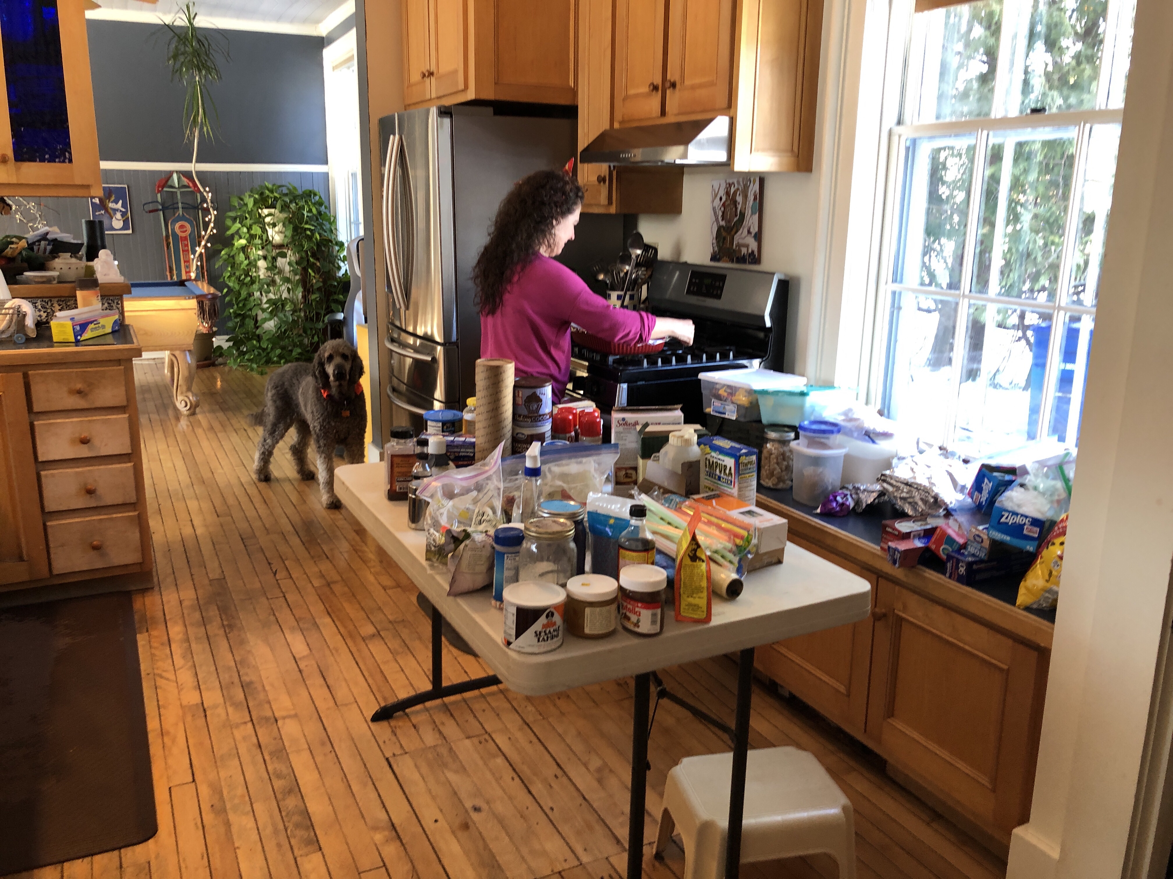 Diane took advantage of the slow down to attach the cupboards. How much Indian picks and hot sauces do we really need ? Good news is she found our tofu press !