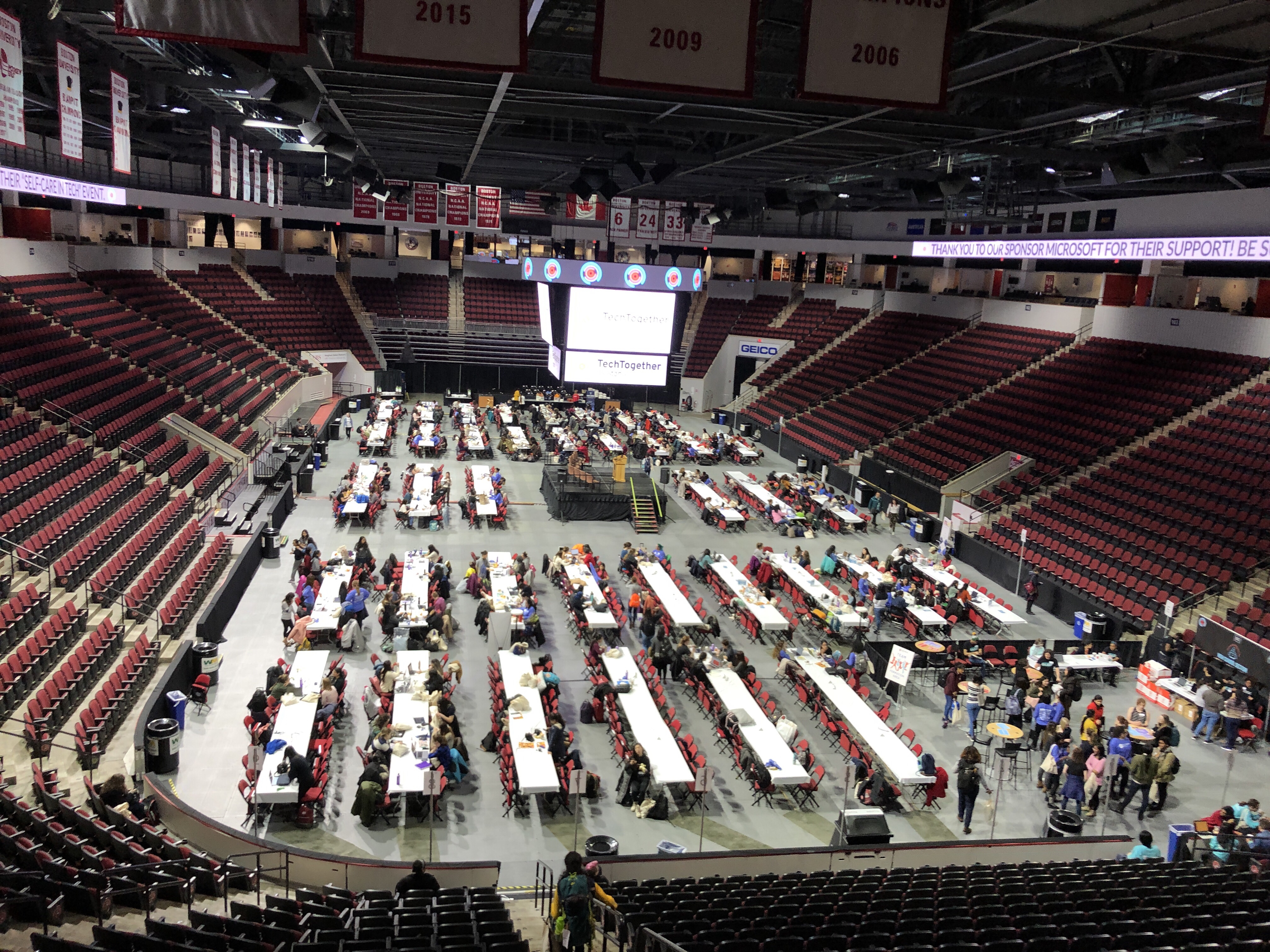 The hacking happens down on the floor of a giant auditorium. I was here once before for first robotics challenge