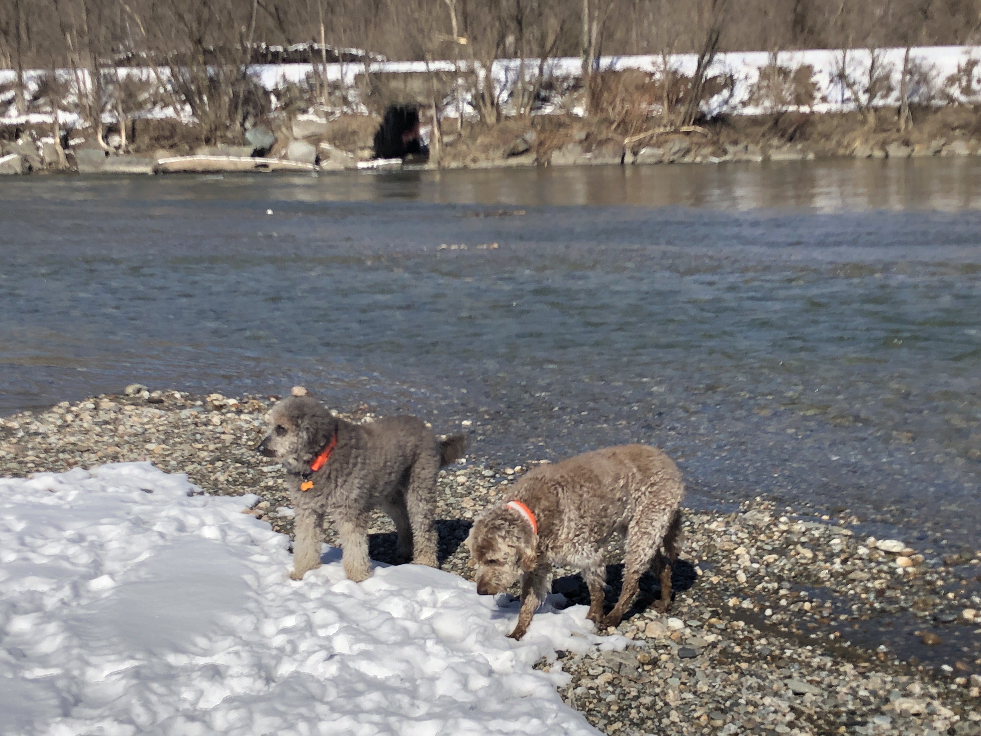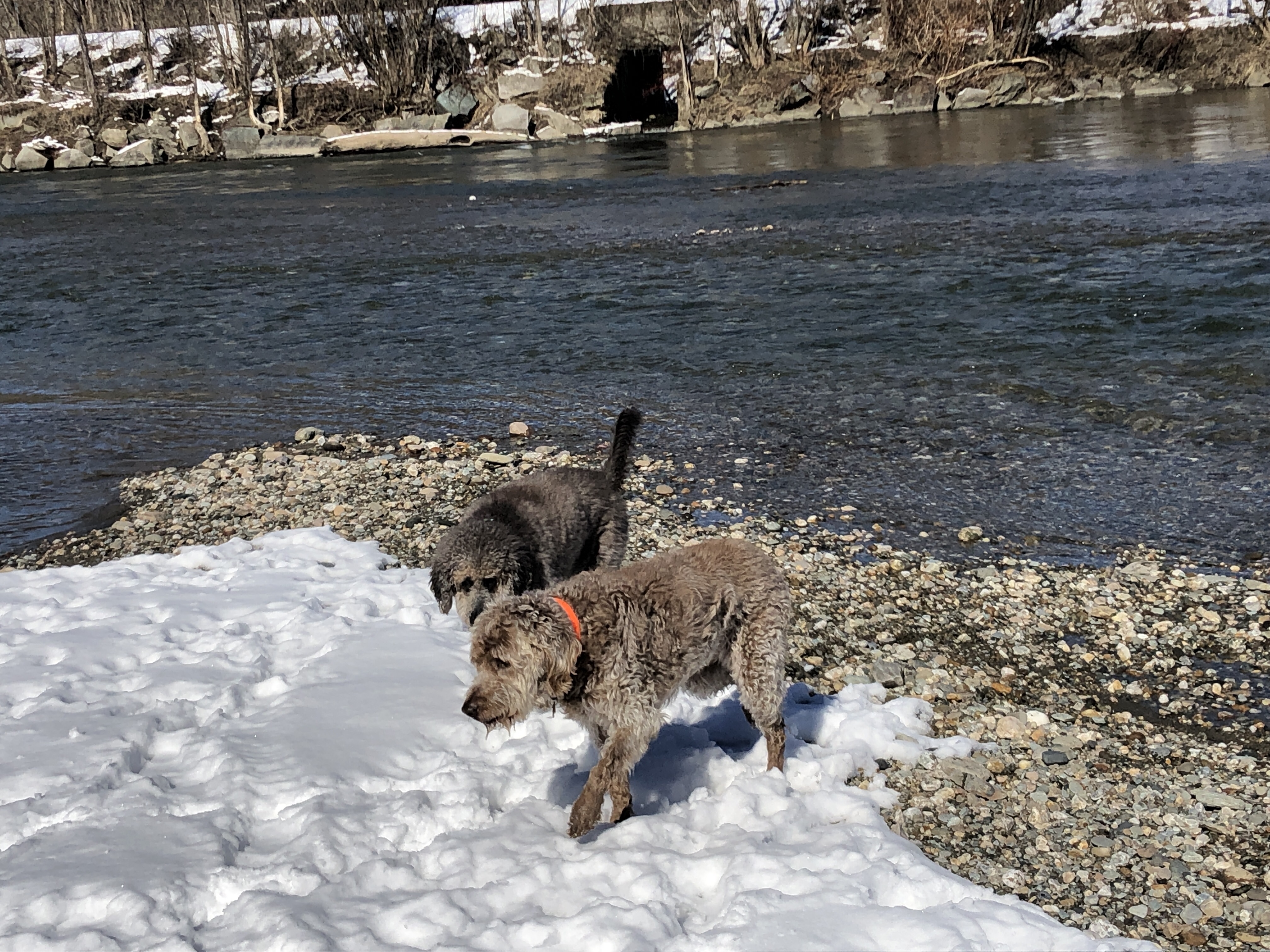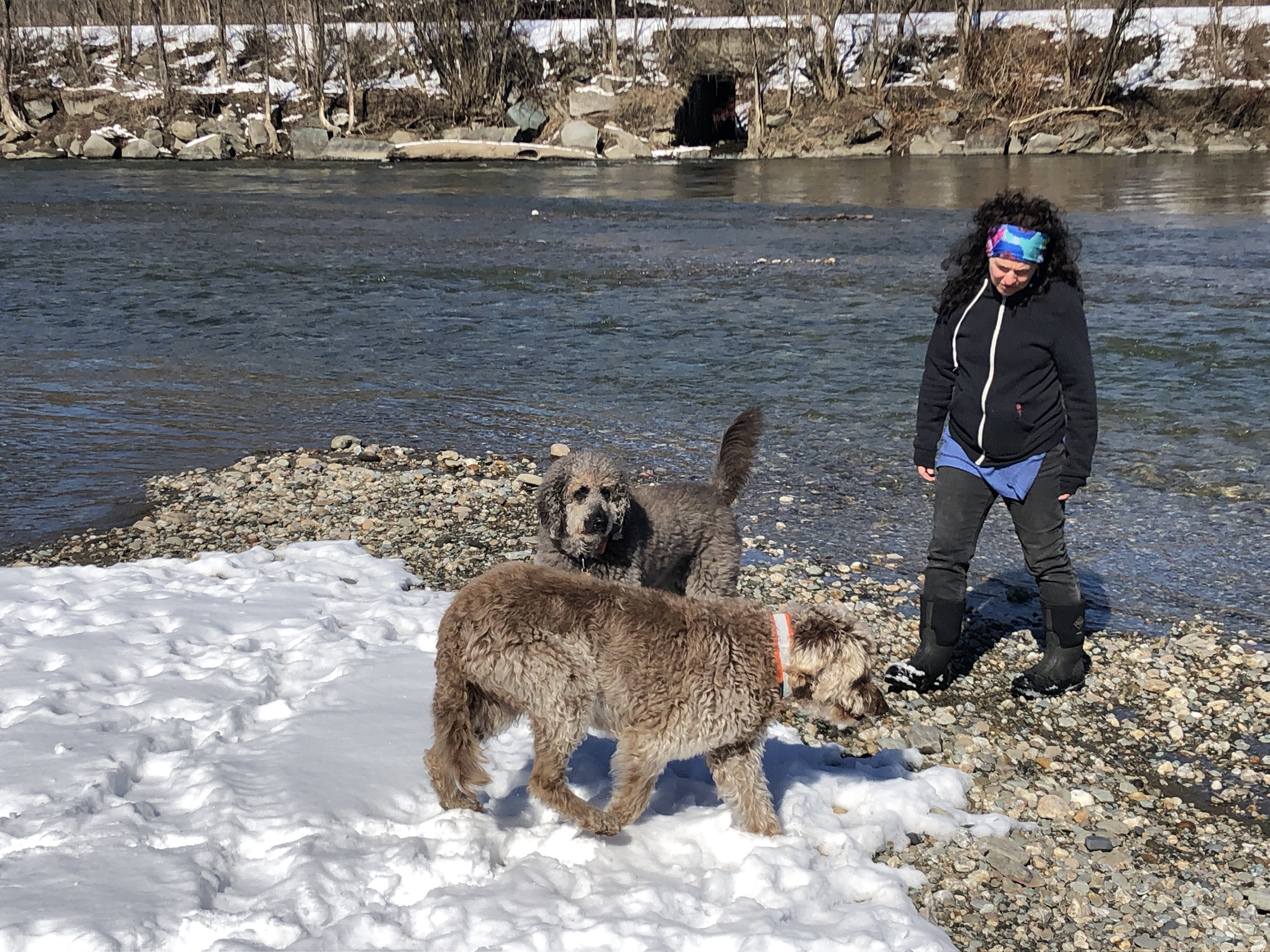 Earlier today got to go out for a nice run and then a walk with Diane and the dogs by the river shore .