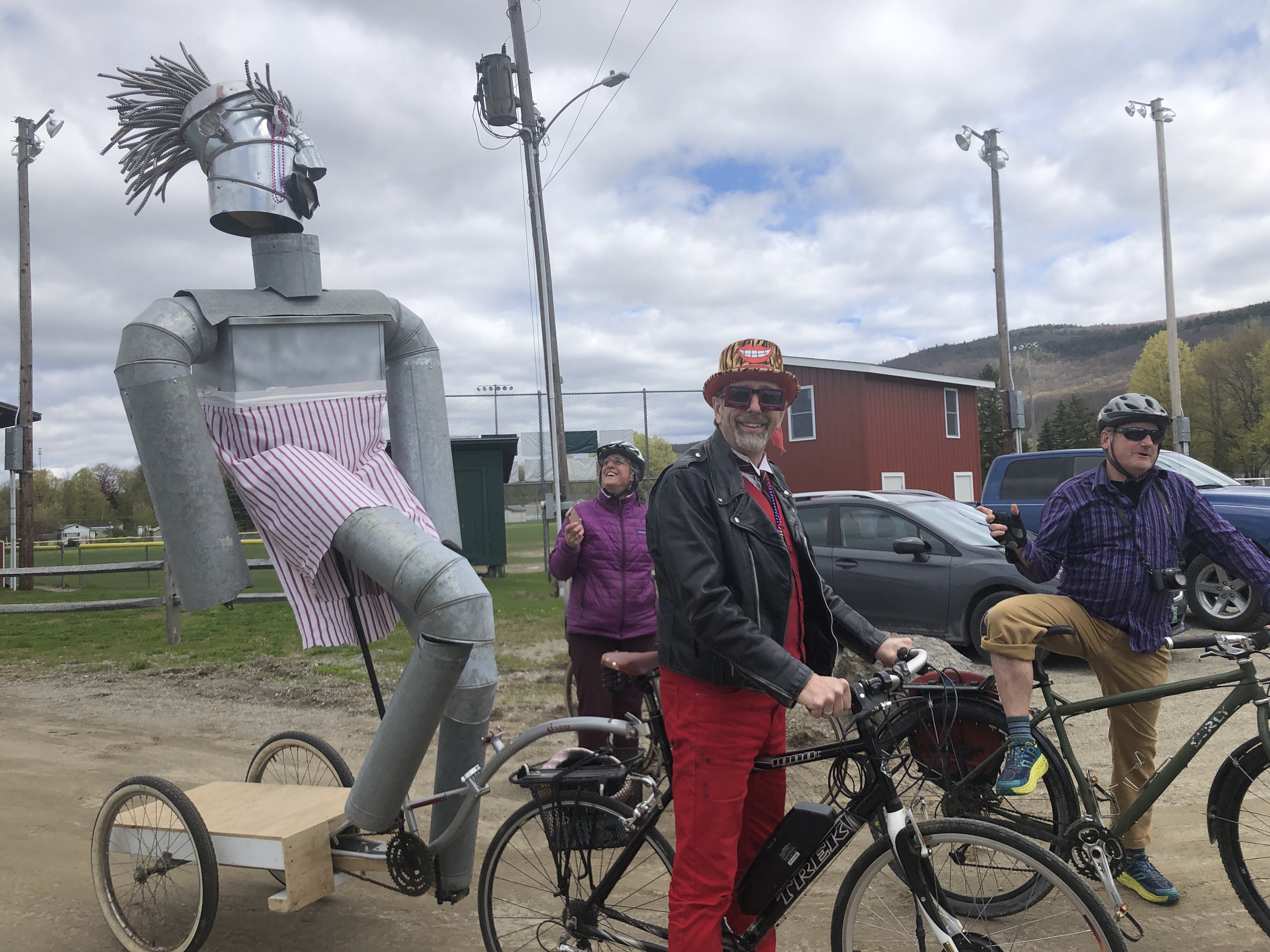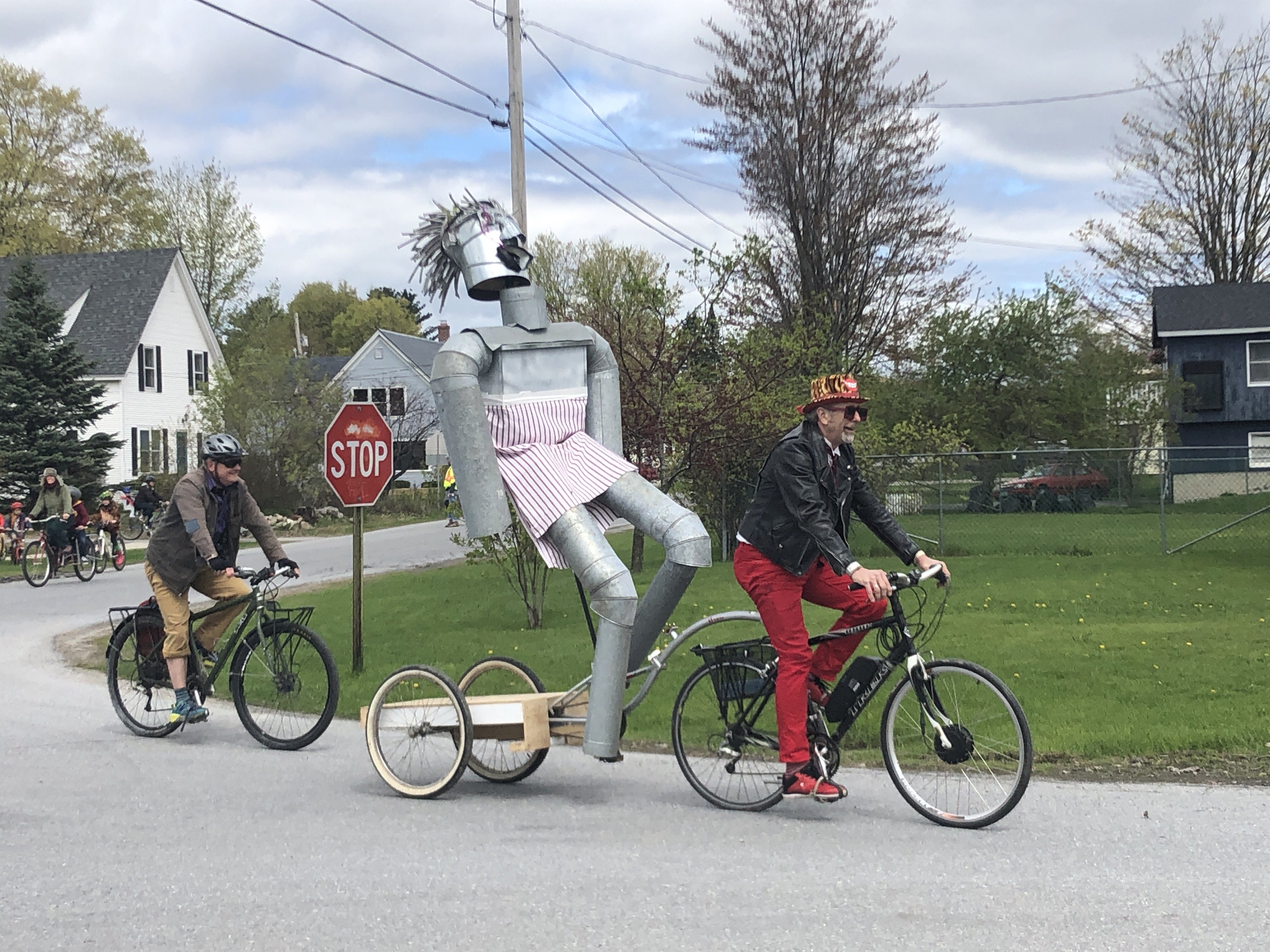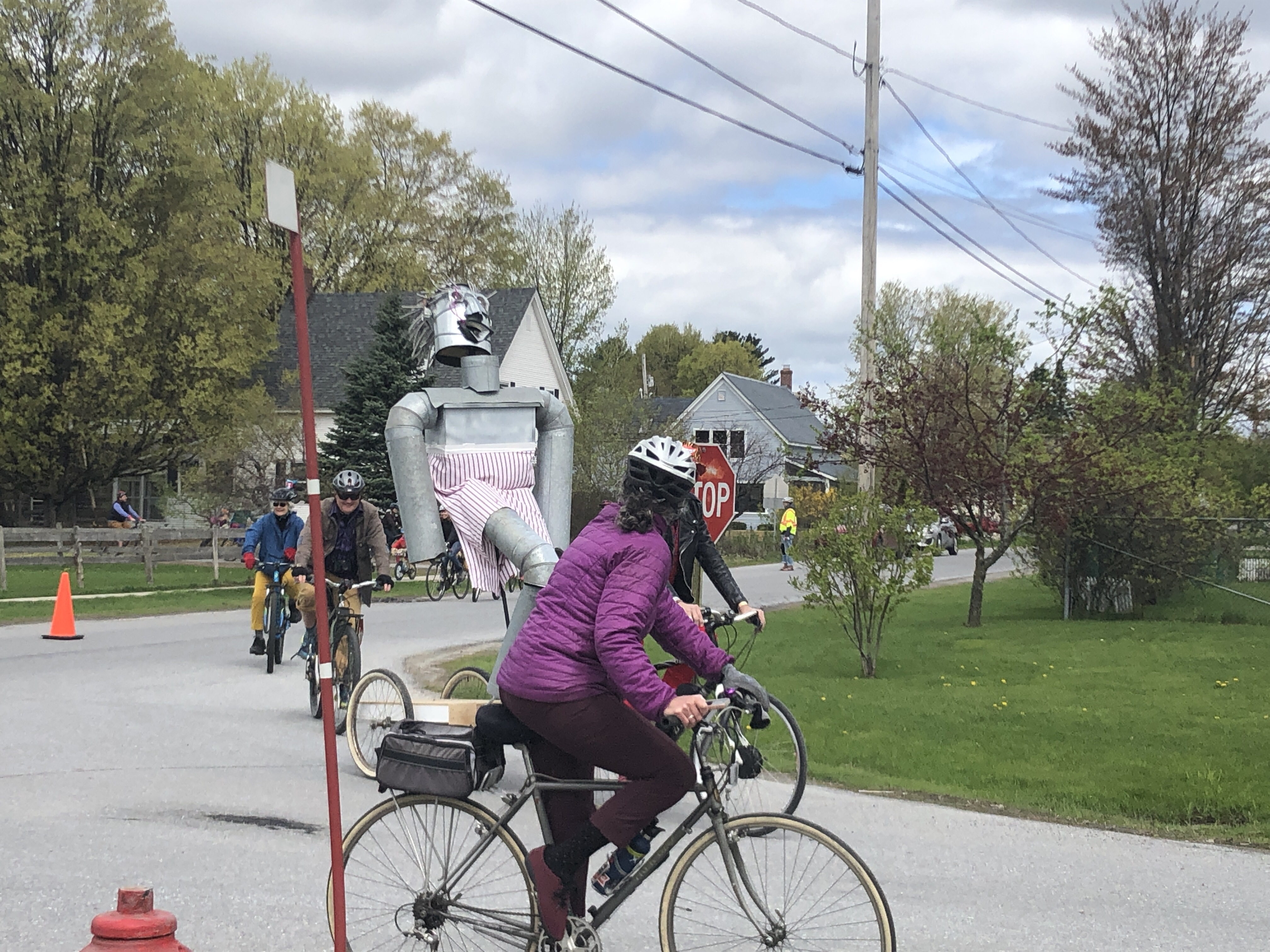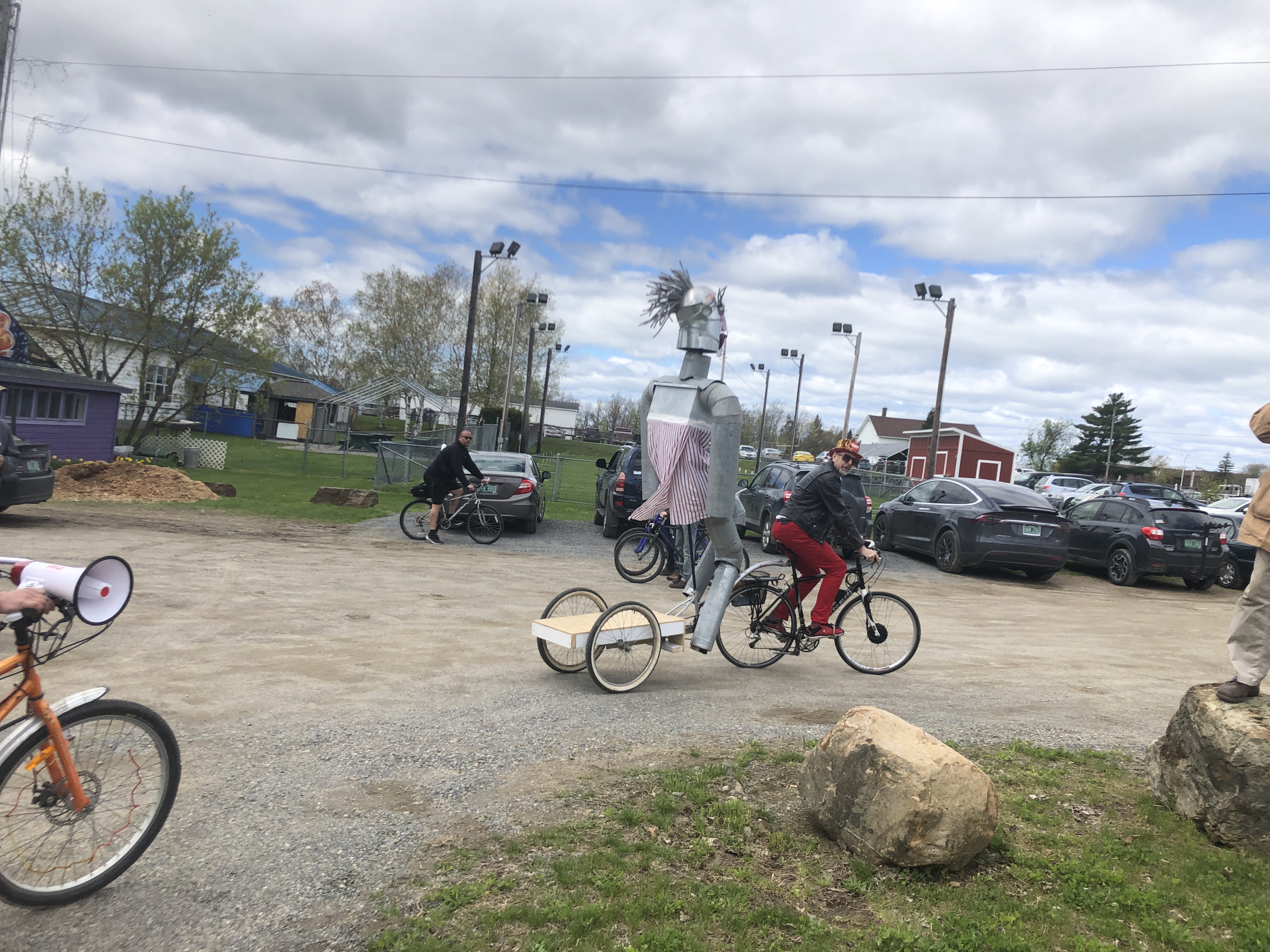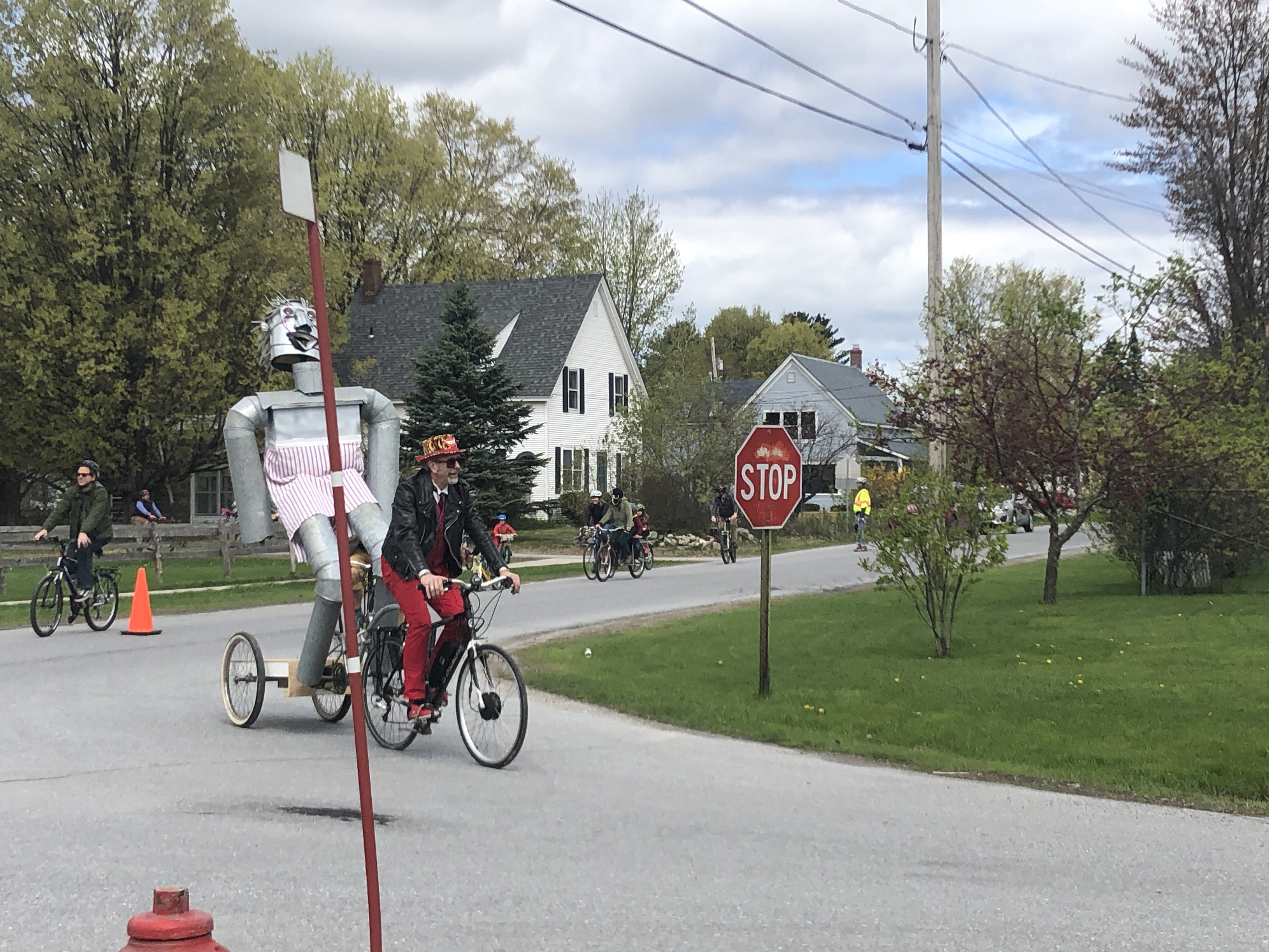 Diane and i had a nice quiet night at home today. I needed it because work has been pretty stressful these past couple of weeks ..We spent most of the day gardening.. but our main venture out was to the Bristol human. Powered kinetic parade . Bristol is a tiny town in west central Vermont that bills itself as the “gateway to the green Mountains” . We got there about 10:30 and met up with our good friend and former roommate Priscilla.. she’s a local and guided us through the sweet town to the high school. There was a good crowd there despite the chilly weather.