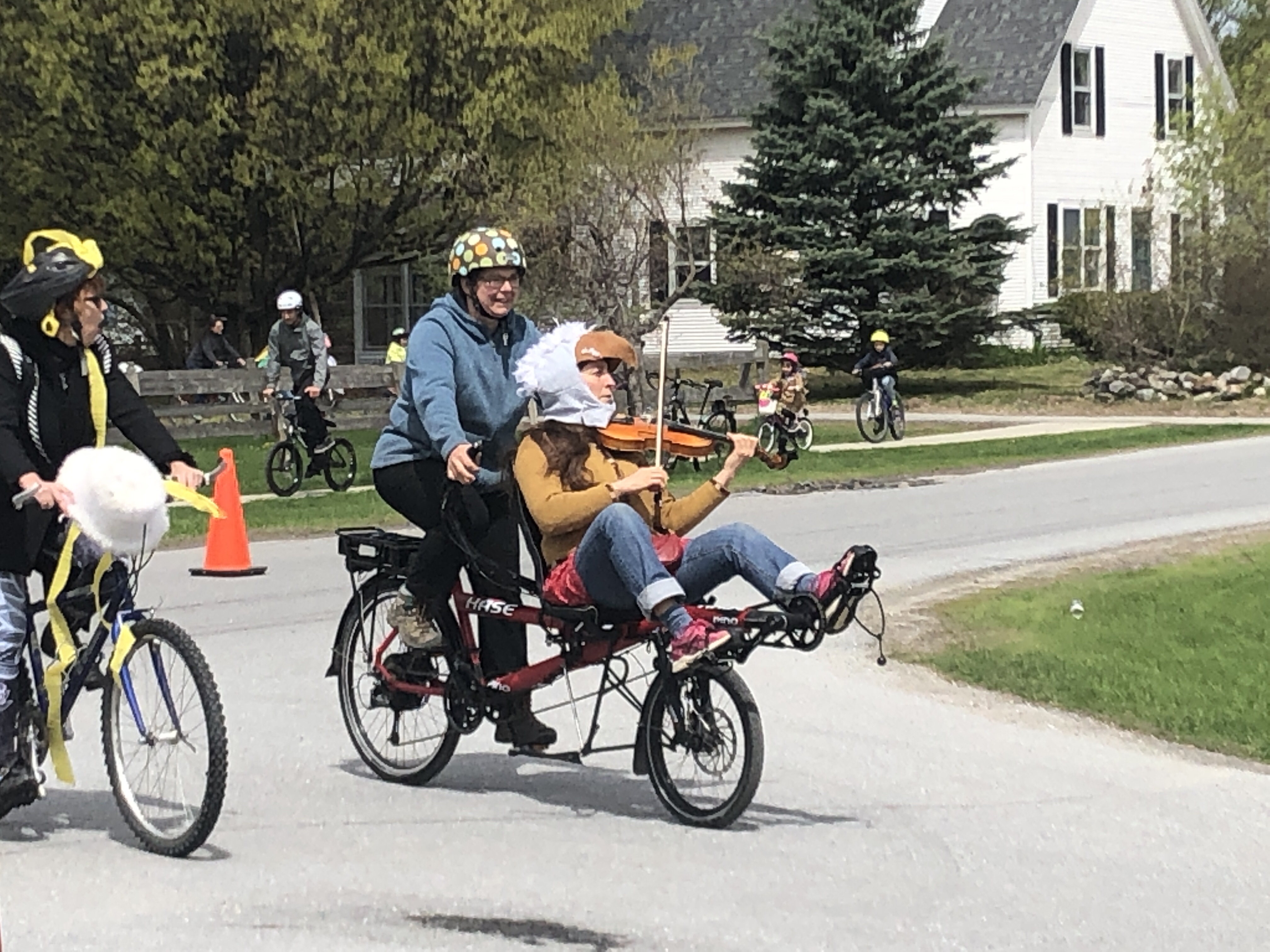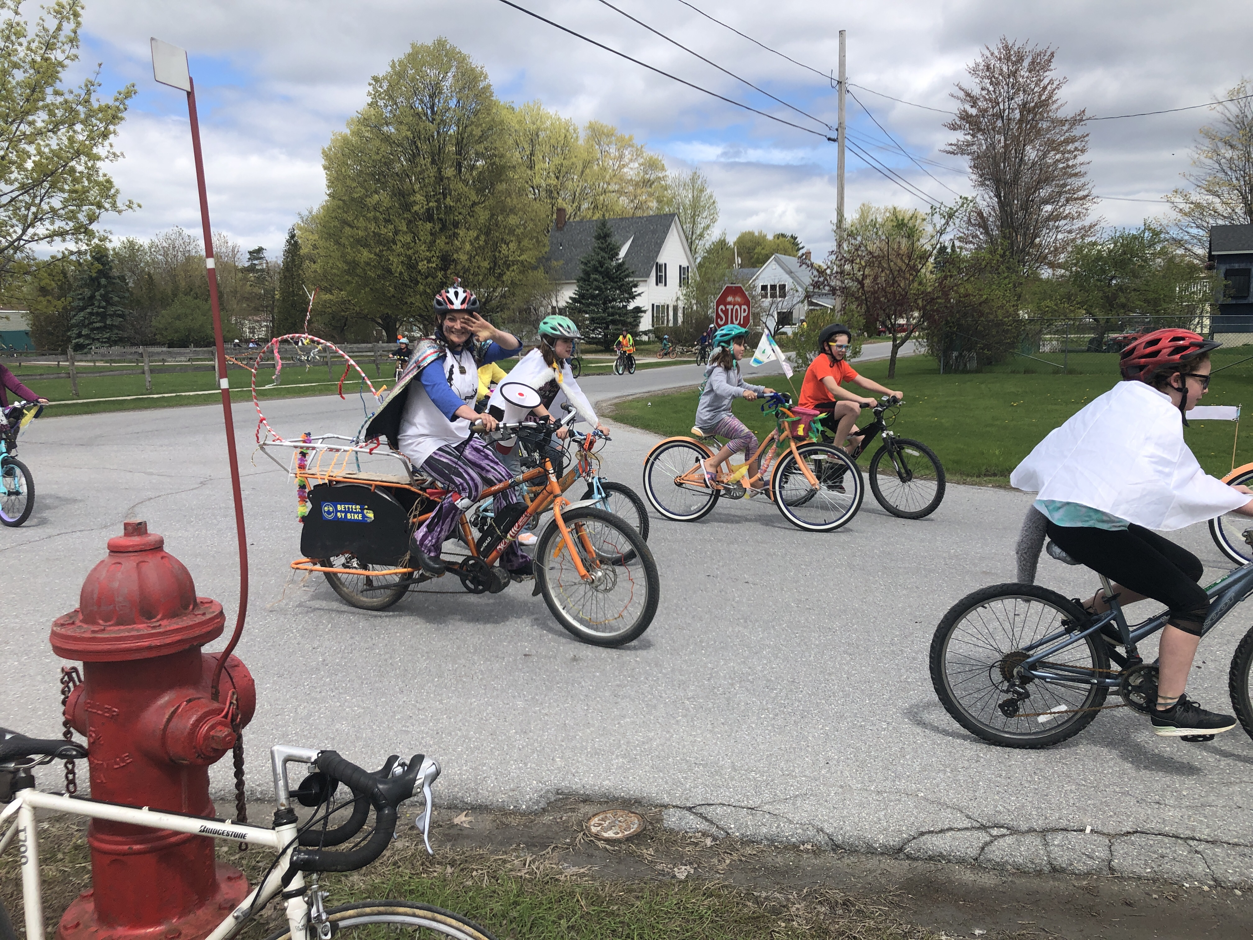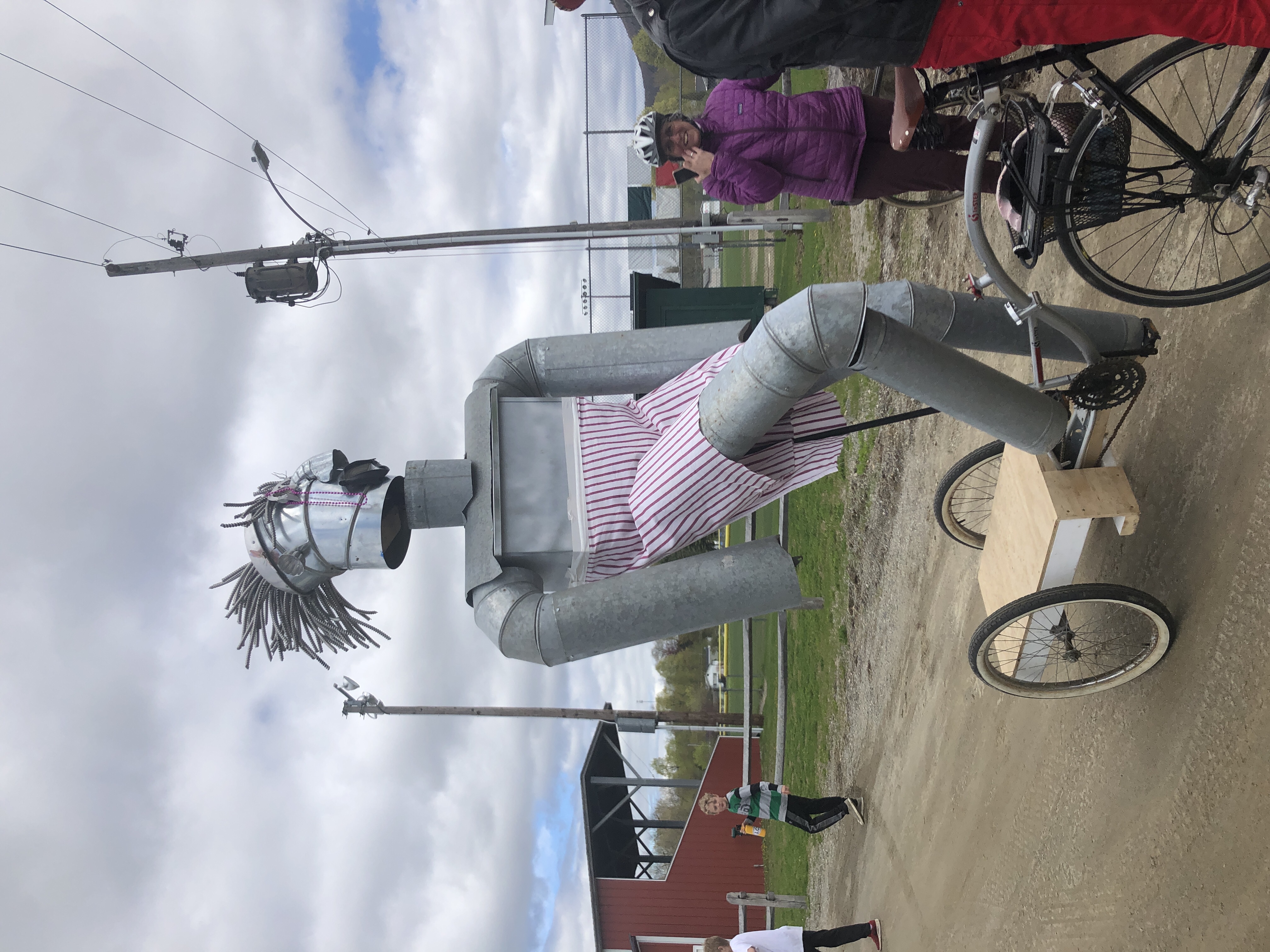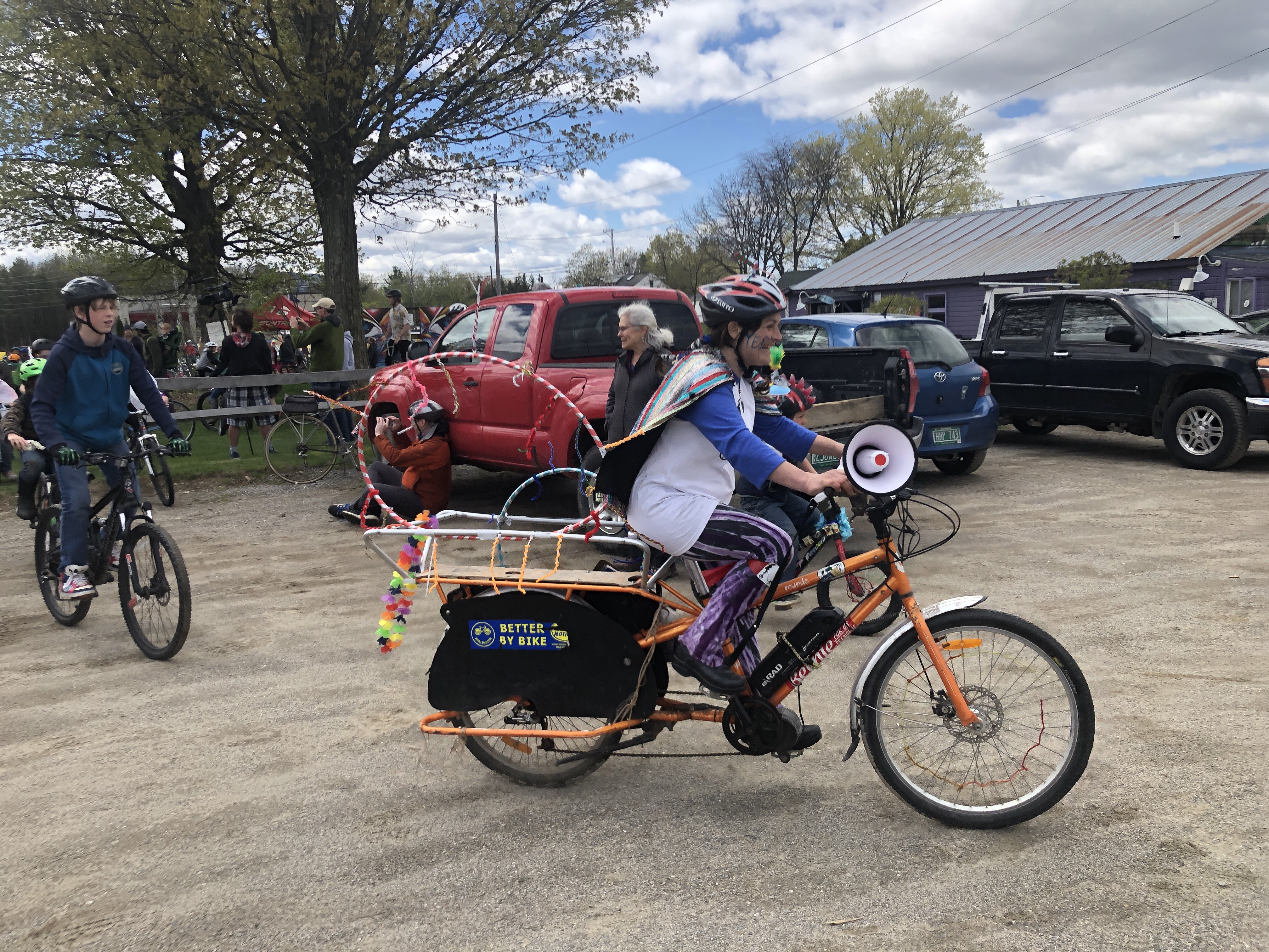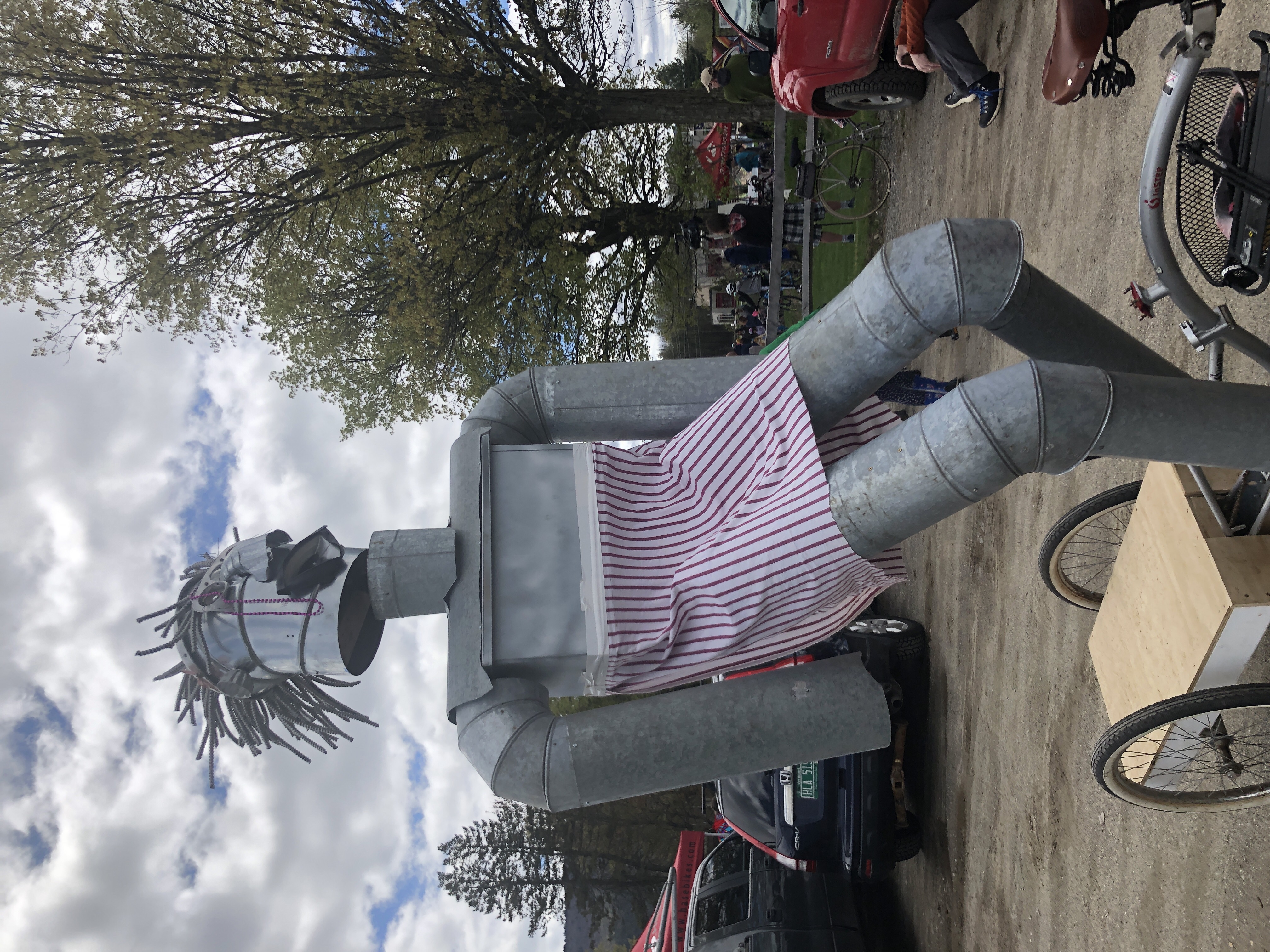 Diane and i had a nice quiet night at home today. I needed it because work has been pretty stressful these past couple of weeks ..We spent most of the day gardening.. but our main venture out was to the Bristol human. Powered kinetic parade . Bristol is a tiny town in west central Vermont that bills itself as the “gateway to the green Mountains” . We got there about 10:30 and met up with our good friend and former roommate Priscilla.. she’s a local and guided us through the sweet town to the high school. There was a good crowd there despite the chilly weather.