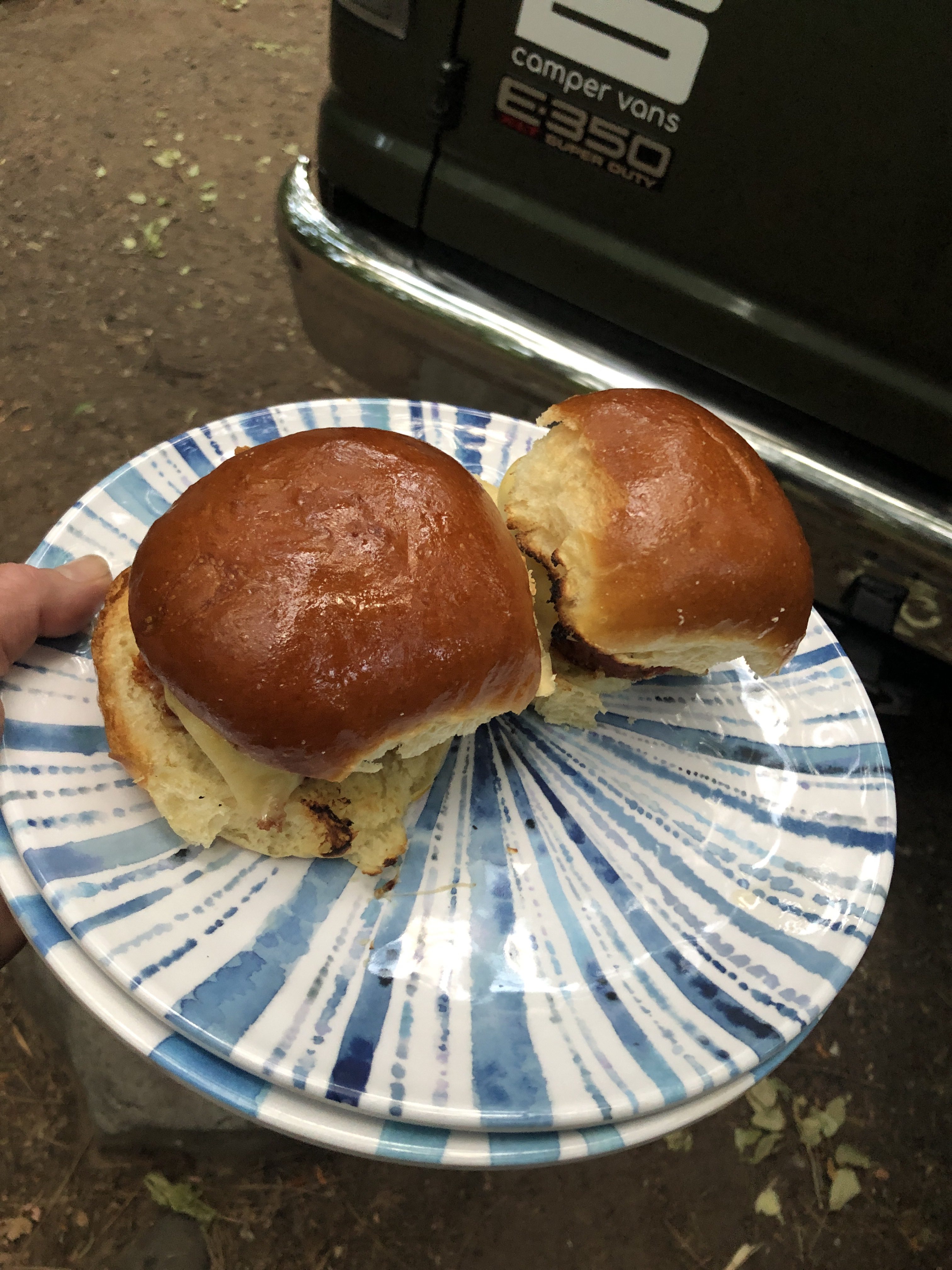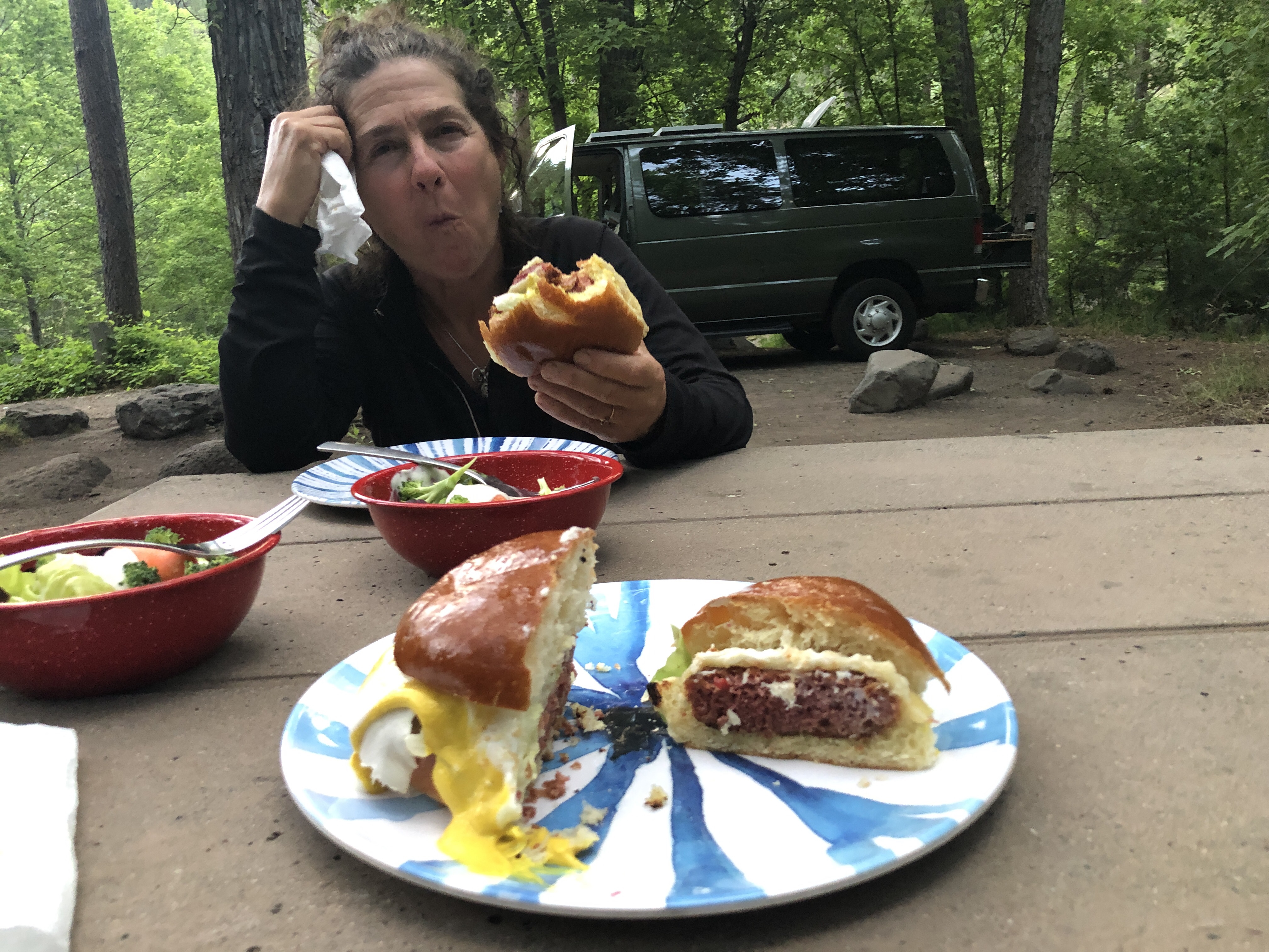 Our camp site is beautiful .. quiet , cool and near a stream . We cooked some veggie ‘beyond meat’ burgers that were amazing