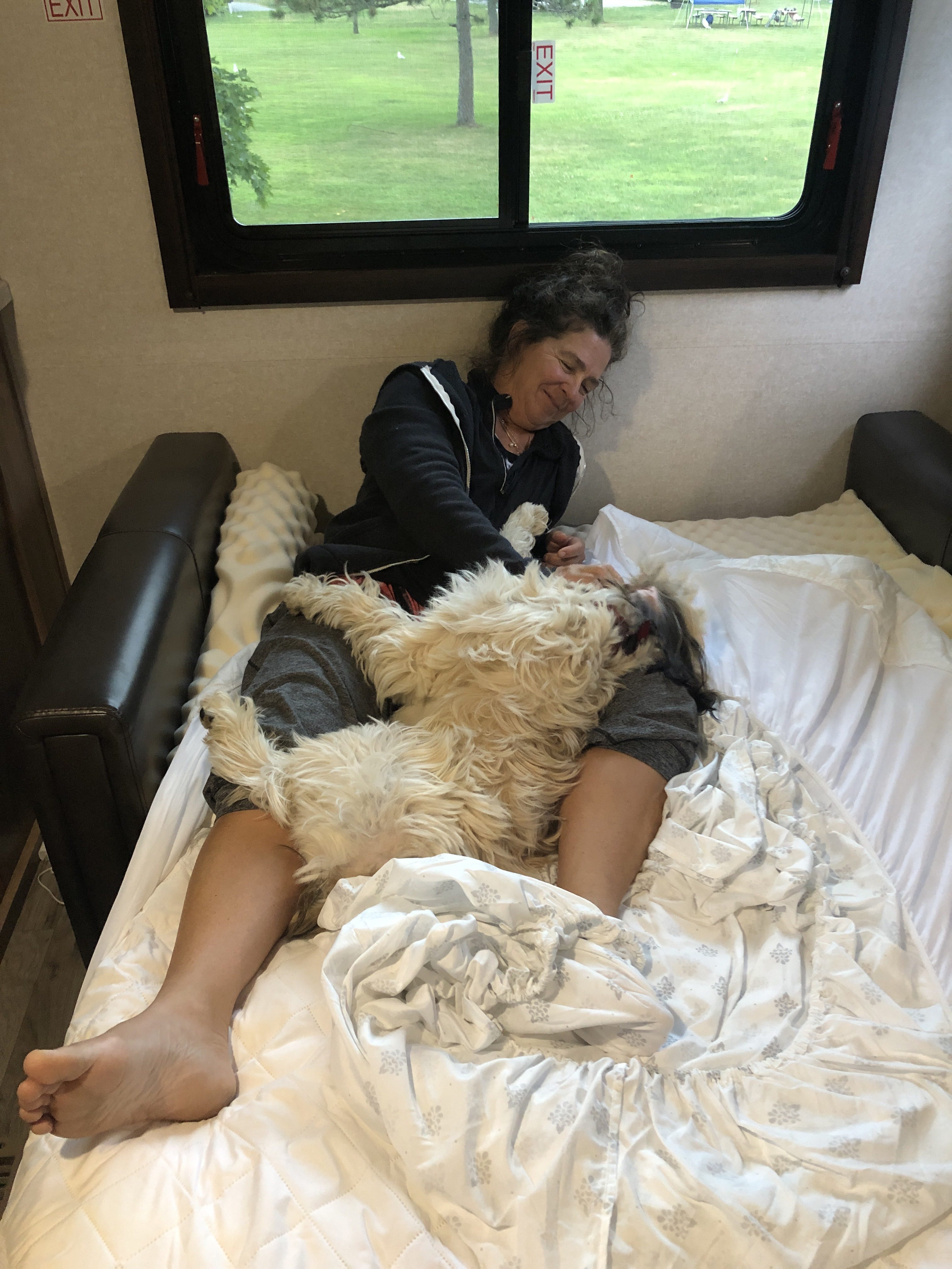 Yesterday we spent the nicest day Just hanging out with Linda and david in the camper on Wellesley Island. Weather was perfect and for most of the day we just sat in the sun. It was heavenly. This is only their third time out in the camper… But their old president now. Space really does have every comfort of home. Including their Really cute dog… Willow !