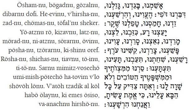 One thing I love about that language is it simplicity and predictability. Many of the prayers are written as acrostics… That means either the first letter or sometimes strangely the second letter spells out the Hebrew alphabet. It’s like a secret code… One examples is the ashamnu.. It’s a listing of all the possible things you might have done wrong in the past year… You actually are supposed to thump your chest with every word… That’s kind ofFun and dramatic… Notice reading from upper right to lower left as we do you’ll see the words are begin with the first letter of the Hebrew alphabet… Aleph, bet, gimmel