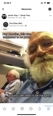 It was a selfie I snapped when I was riding next to Berney one day on the way back to Burlington. Everybody said it was Bernie flying with Santa Claus and it became a Reddit meme about three years ago. Evidently Derrek picked it up and posted it.. And that was two years before we met.