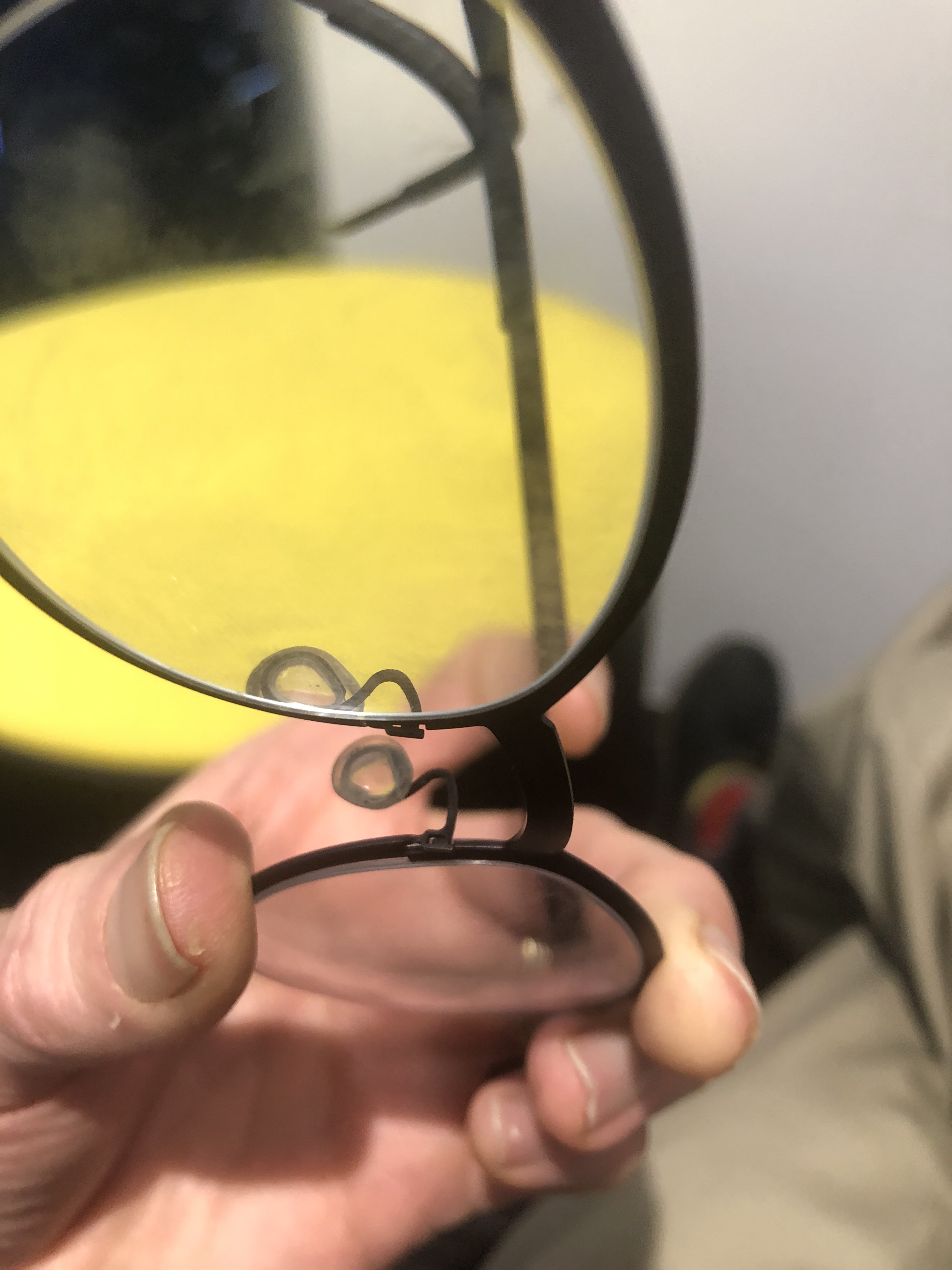 Fun and interesting meeting and Yorktown today. Right at the end I manage to drop my glasses and the left lens Opt out. Normally this wouldn’t be a problem… But without my glasses I can’t see anything closer than New Hampshire. I don’t have a spare set of glasses (which is something I’m about to fix)… But it left me in a strange dilemma. I couldn’t see well enough to repair my glasses. I have these really cool titanium glasses that don’t use screws or any other kinds of fasteners to hold them selves together. The good thing about that is there’s nothing to lose or break the bad thing about it is you need a microscope to see how to put it back together.