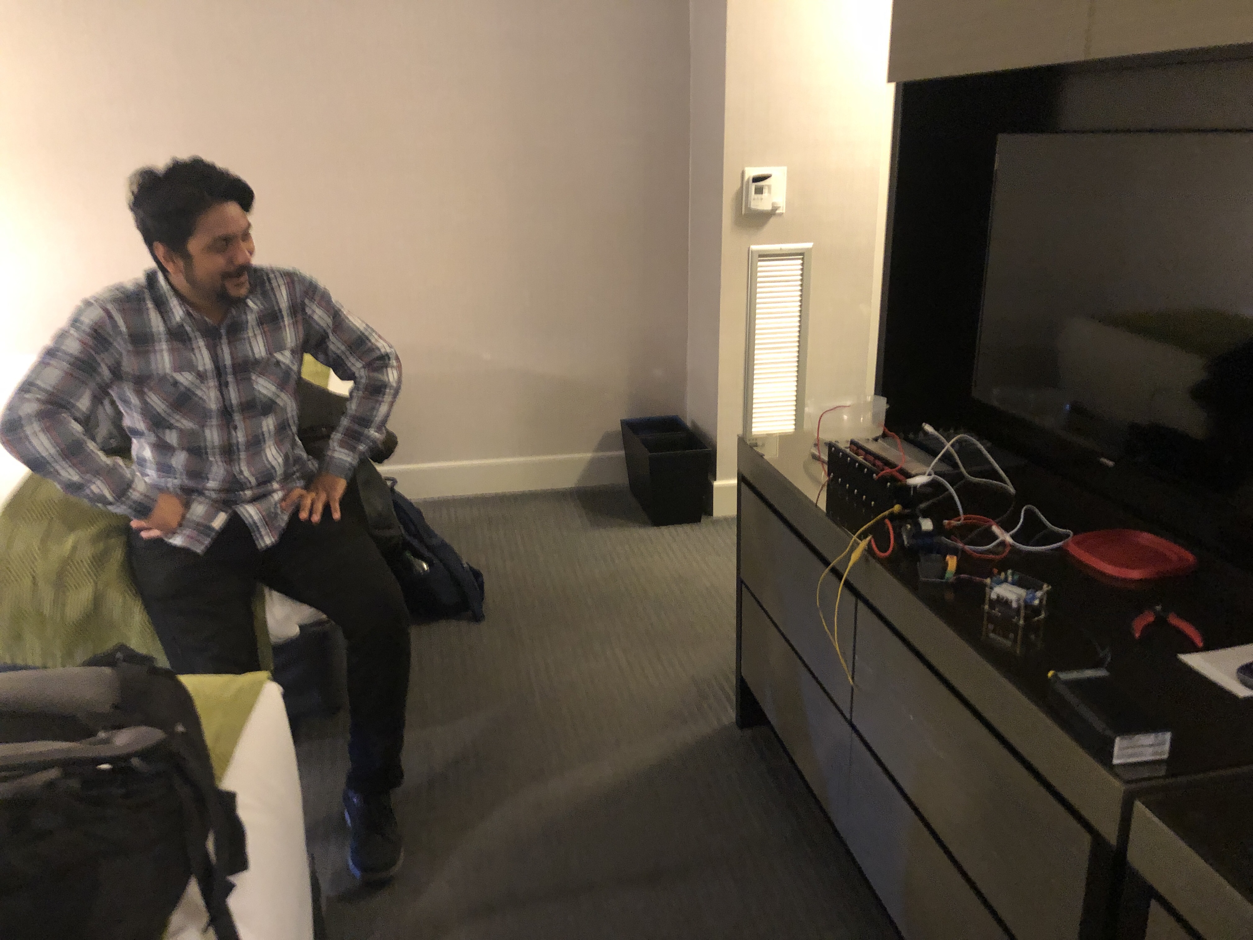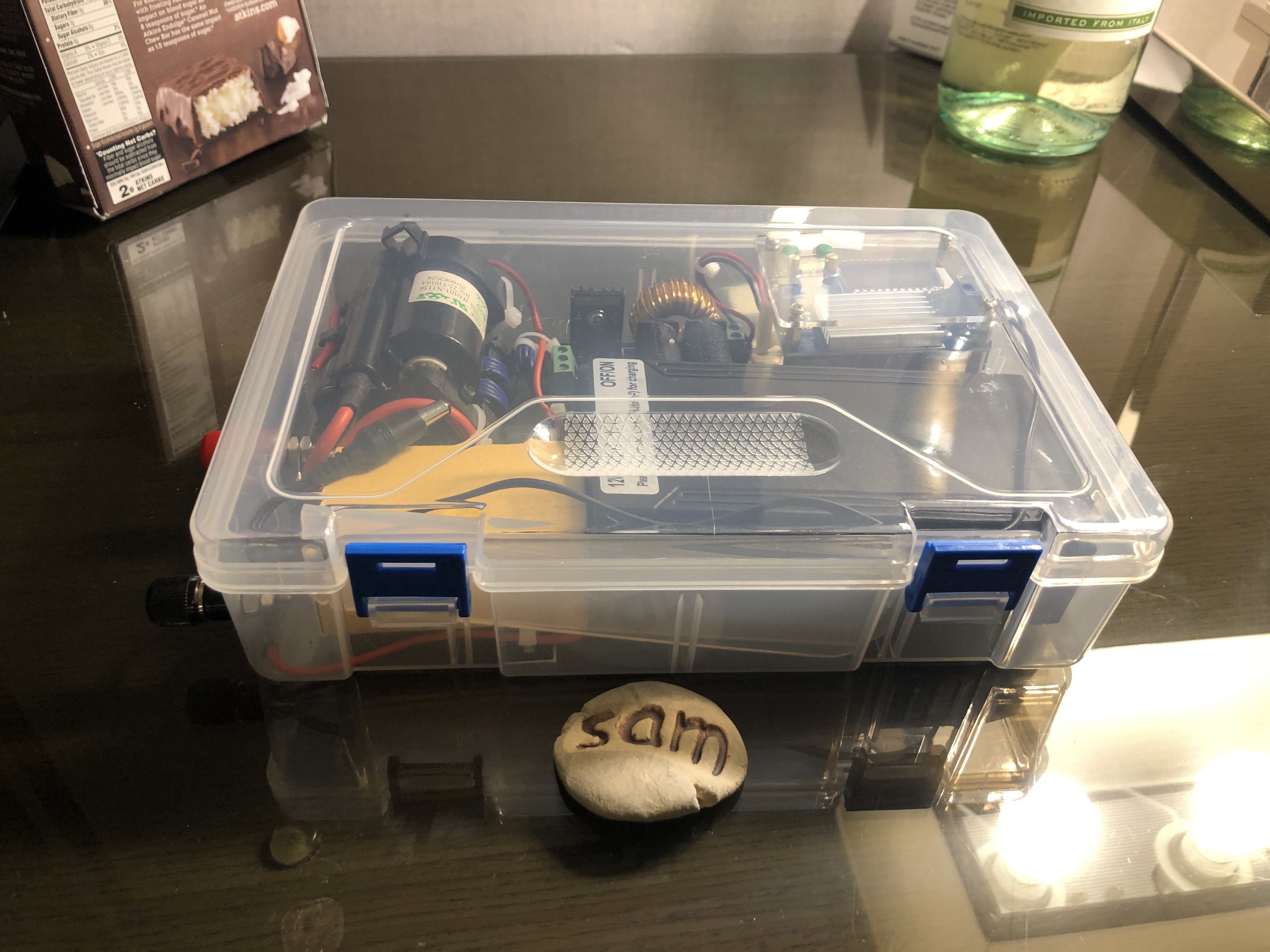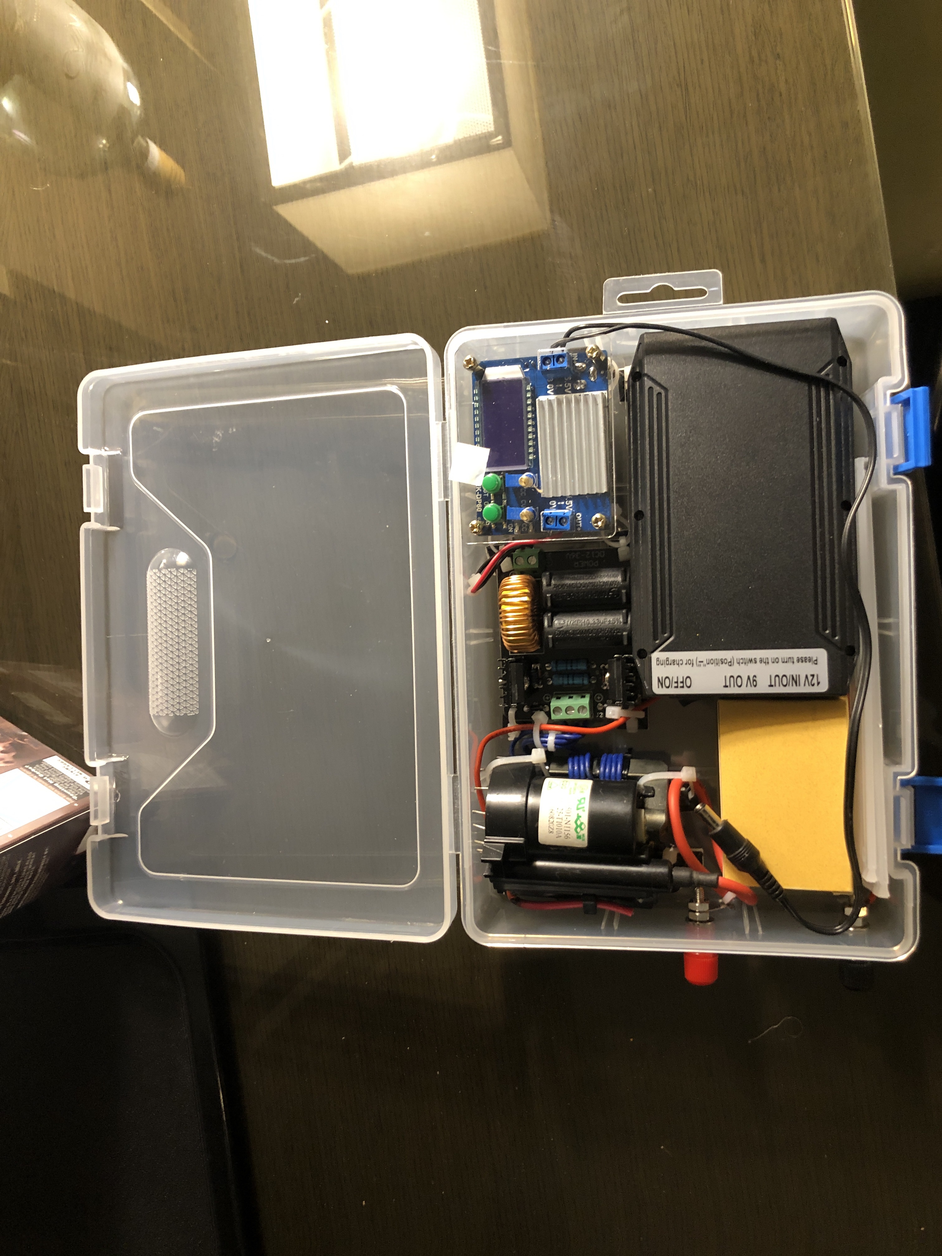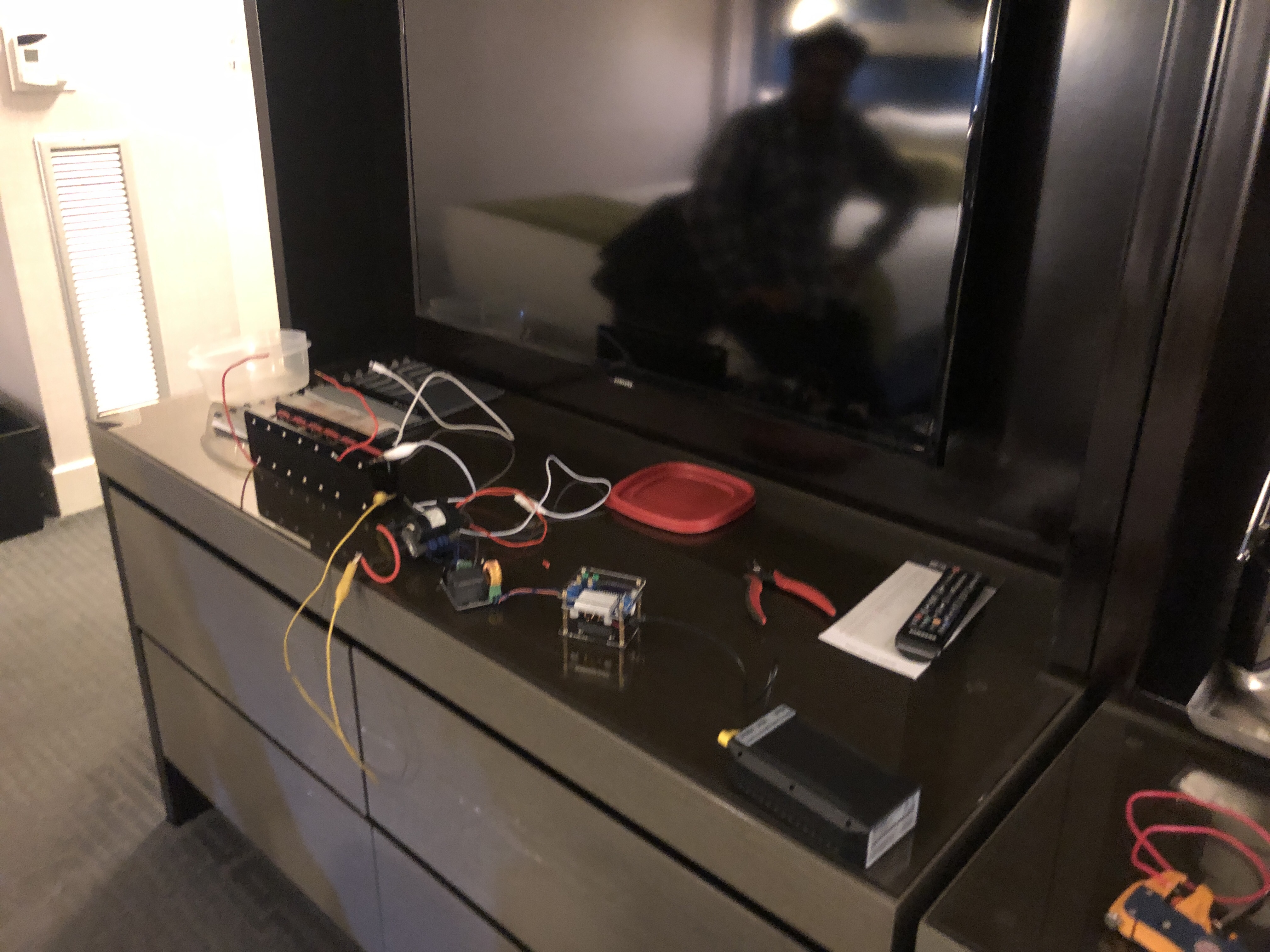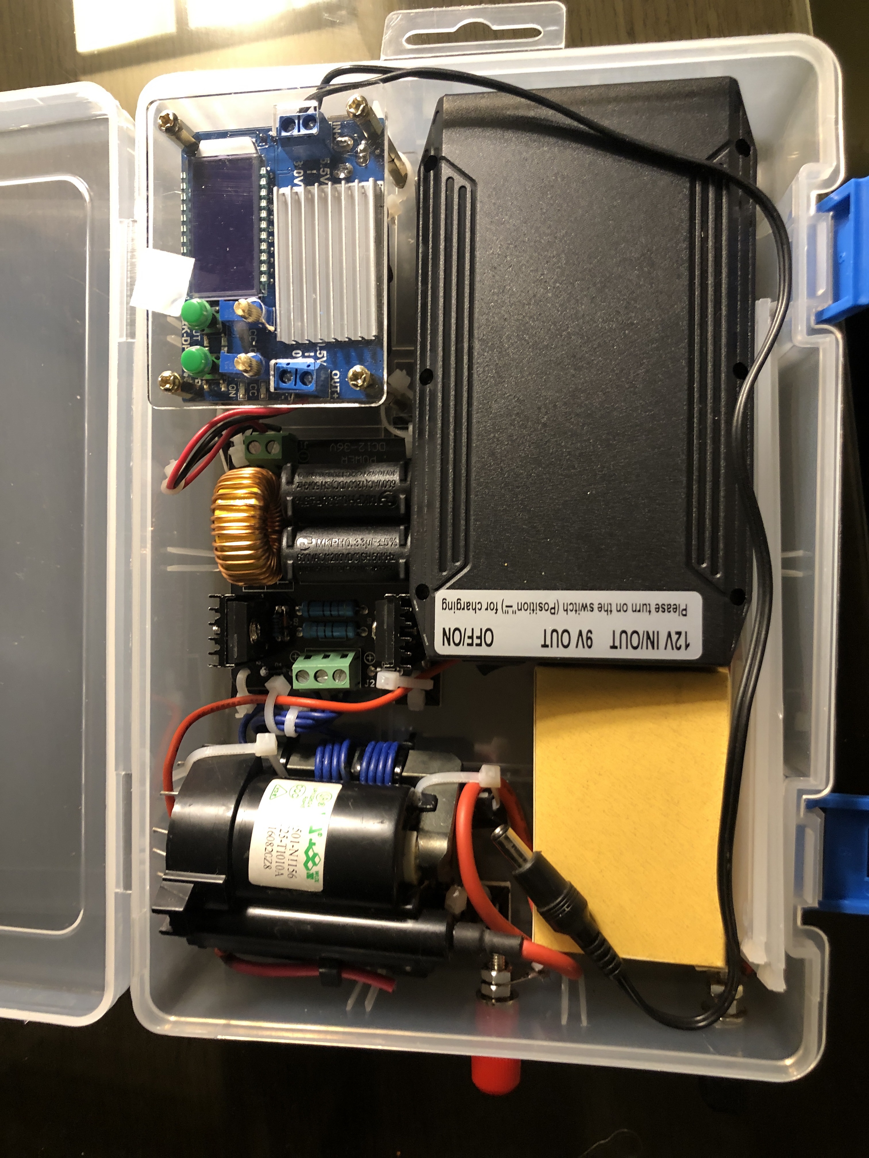 Tonight Akash, Yasmini, Sara And I had a quick dinner at aceitunes. Akash followed me back to the hotel so I could show him the marx generator project I was working on. When he left… I got inspired and decided to package up the whole high voltage supply chains . It was fun trying to do a project like that in the hotel room. I brought some tools and Saturday and iron. But for the most part I had to improvise on tools parts etc. It actually came out pretty nicely. It allows me to make about a 5 inch spark from a simple cell phone brick. Battery