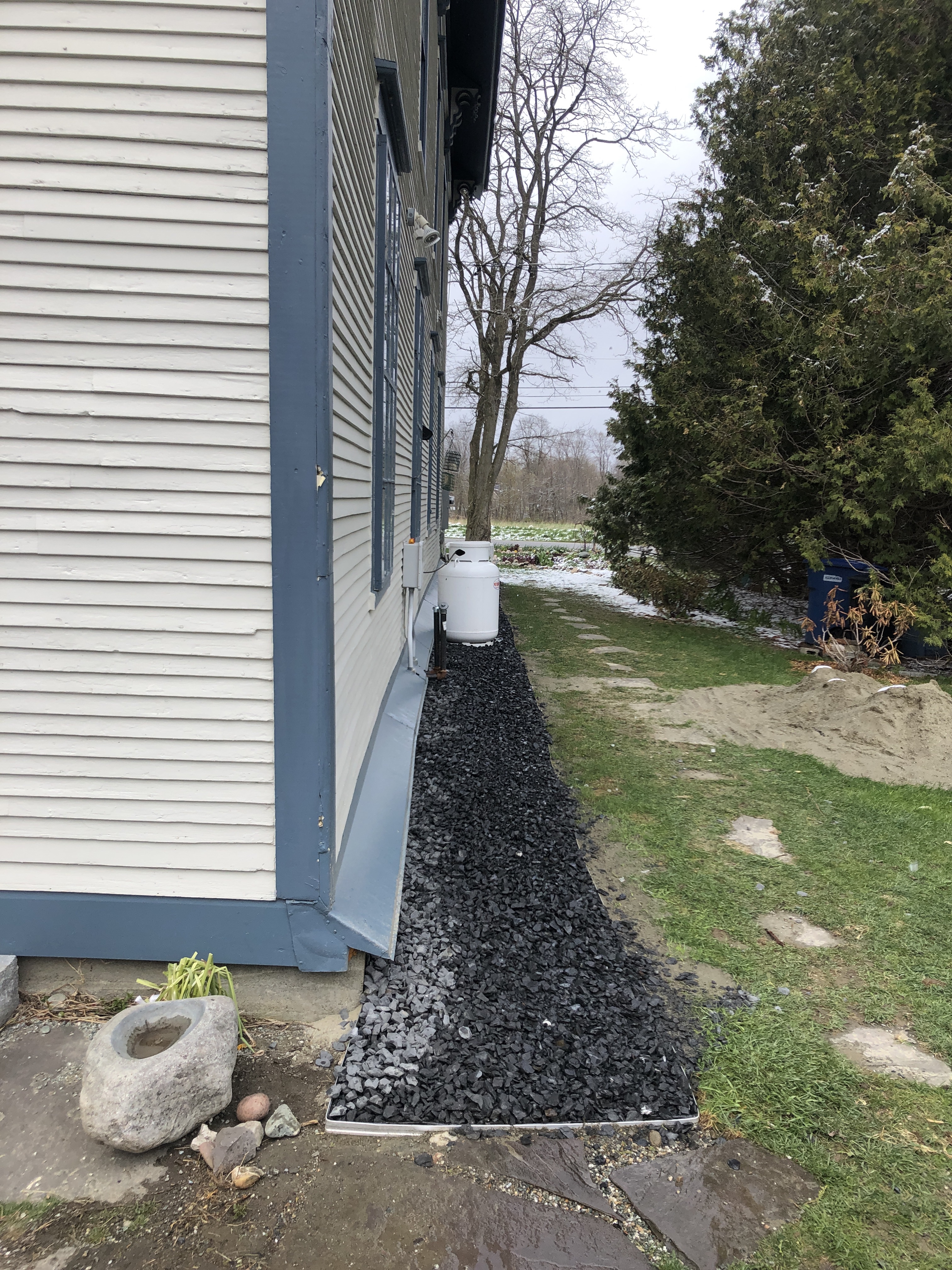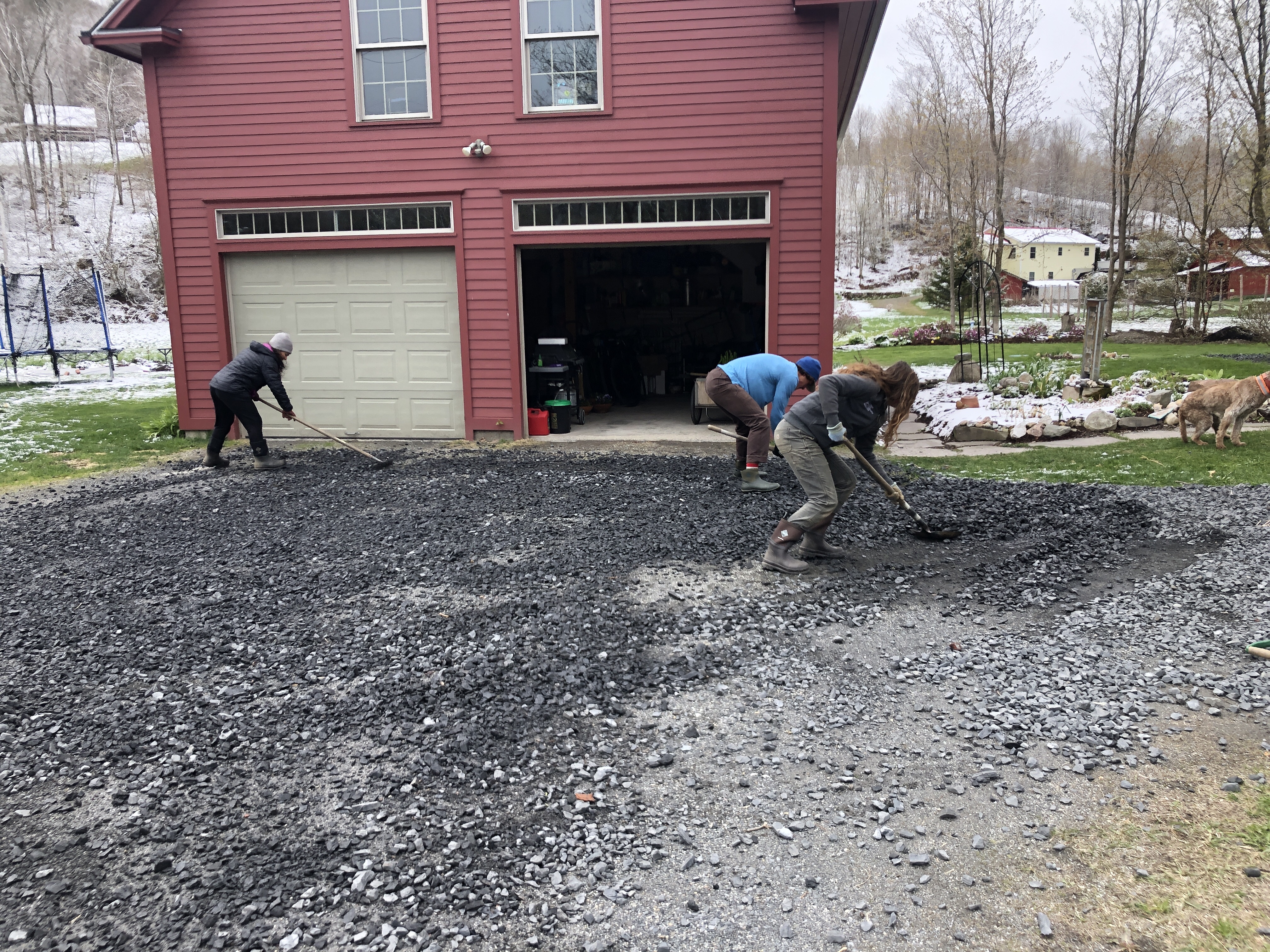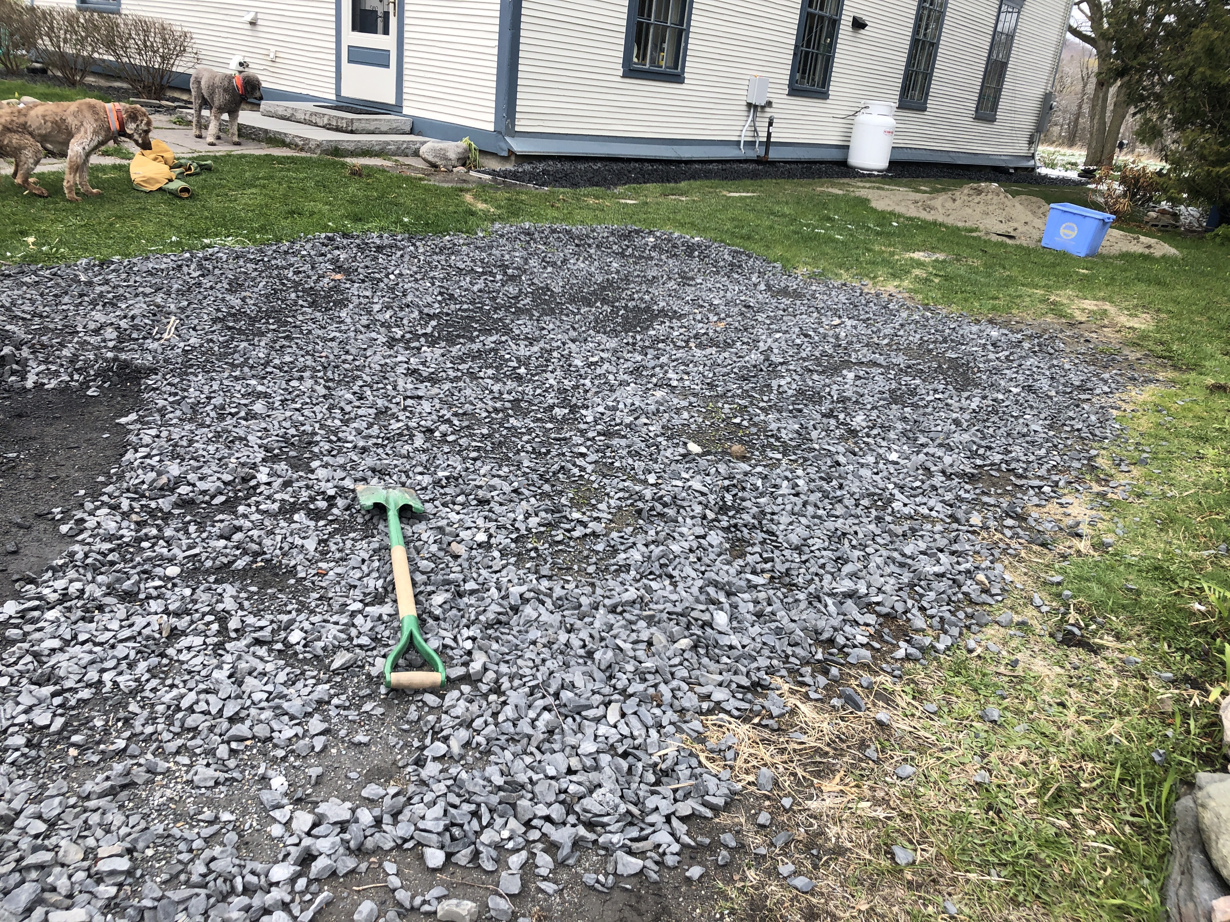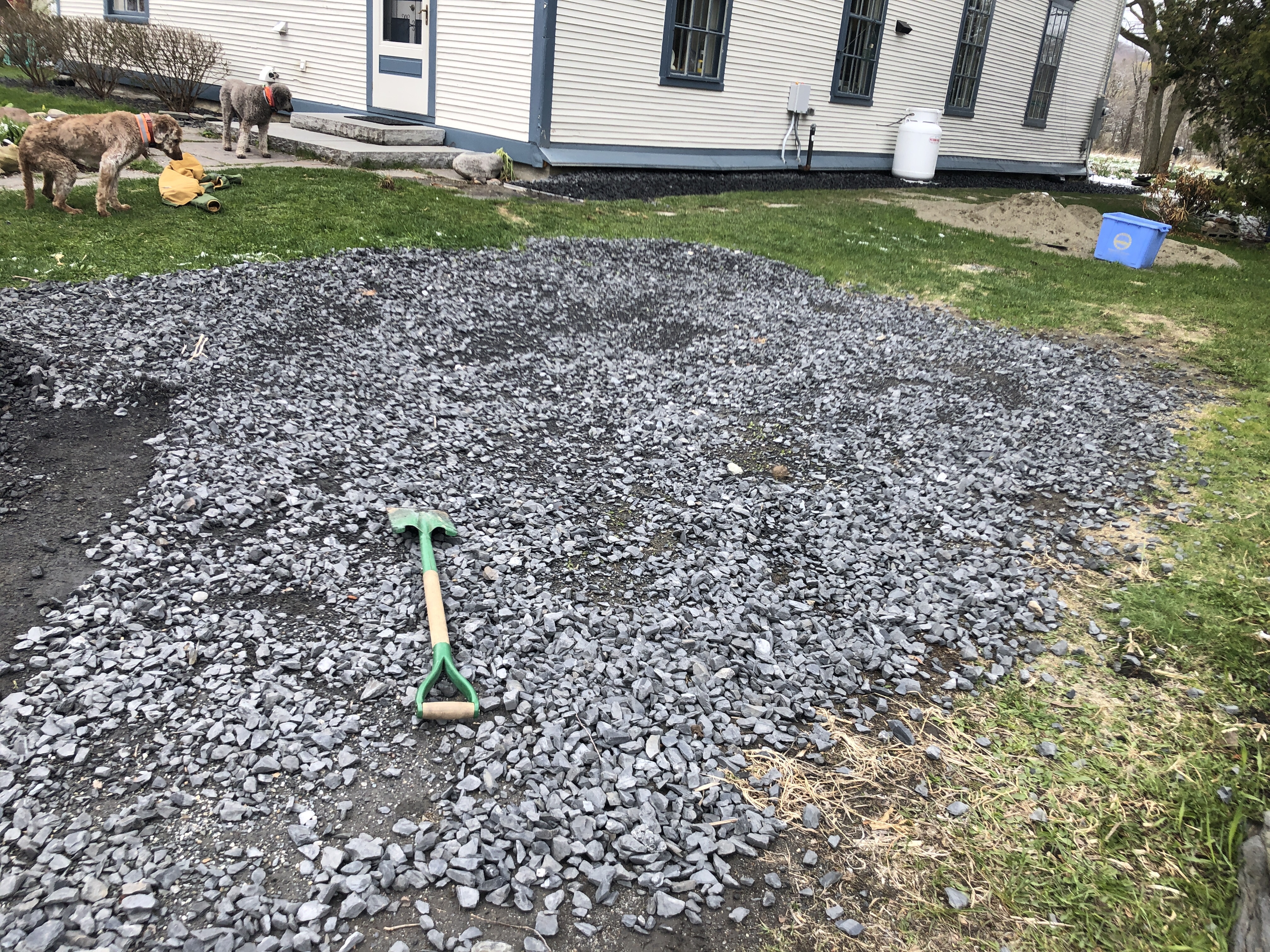 The we all went out and finished spreading the crushed rocks left over from the rework Diane led on the drainage on the left side of the house.