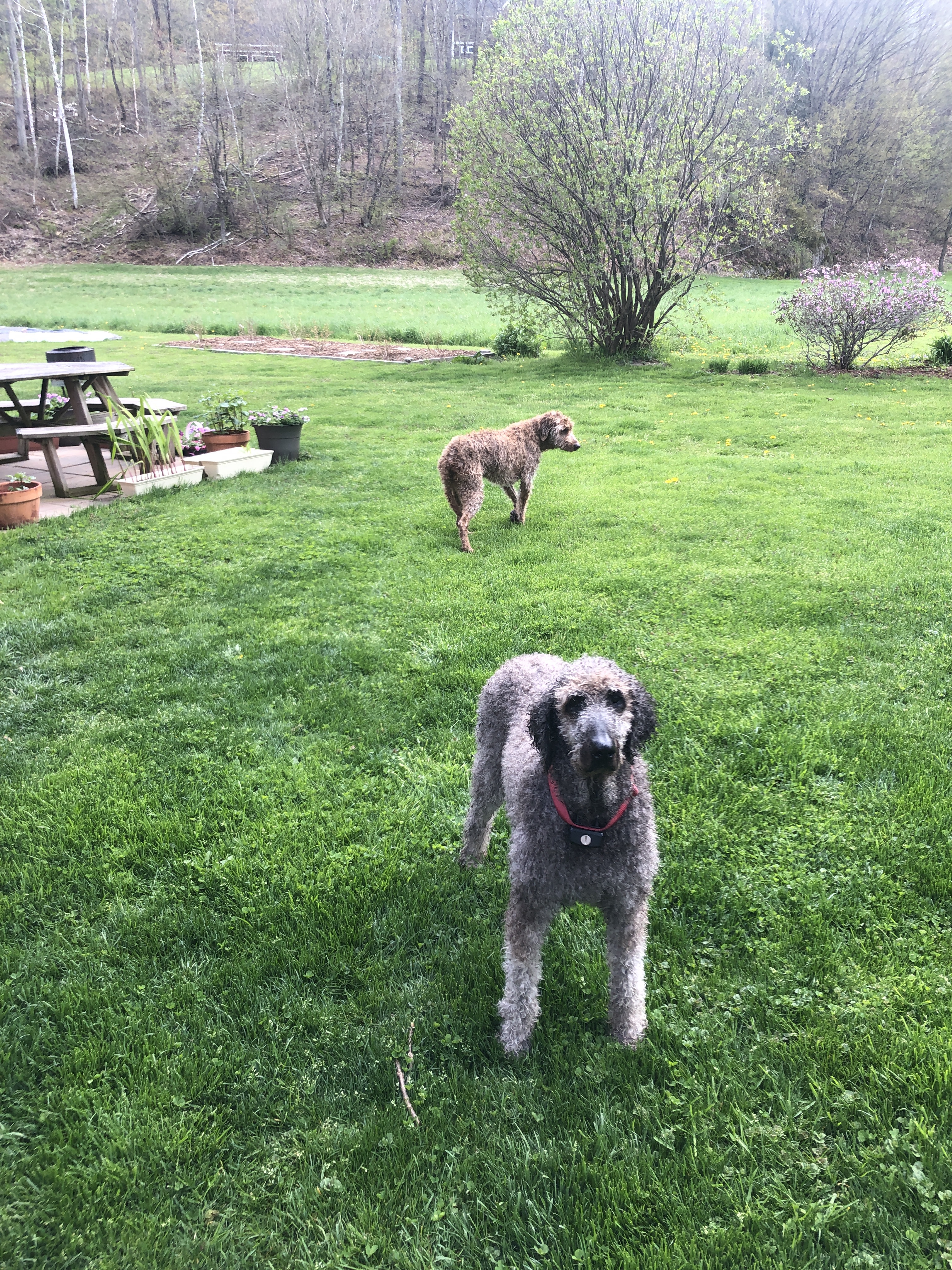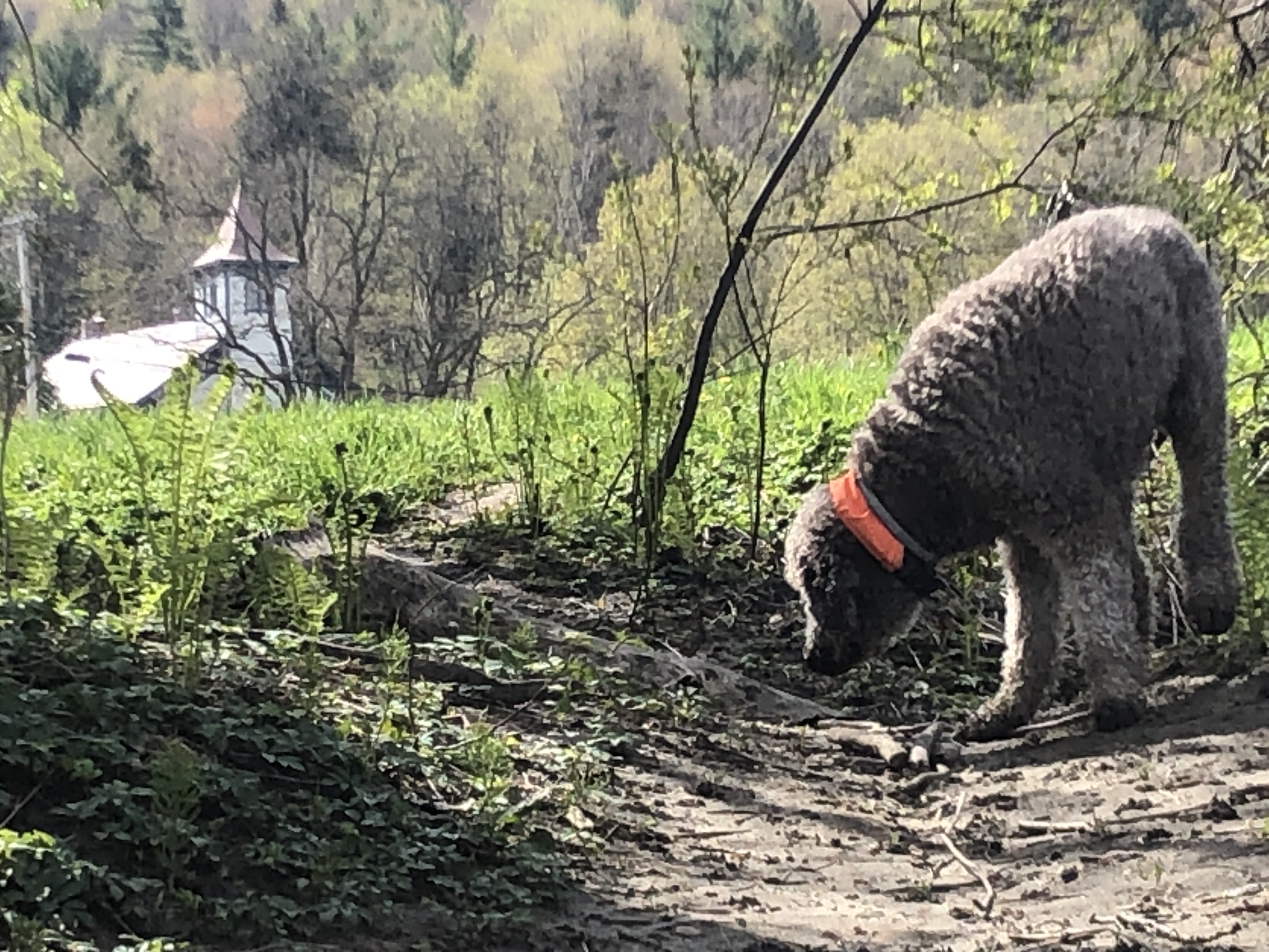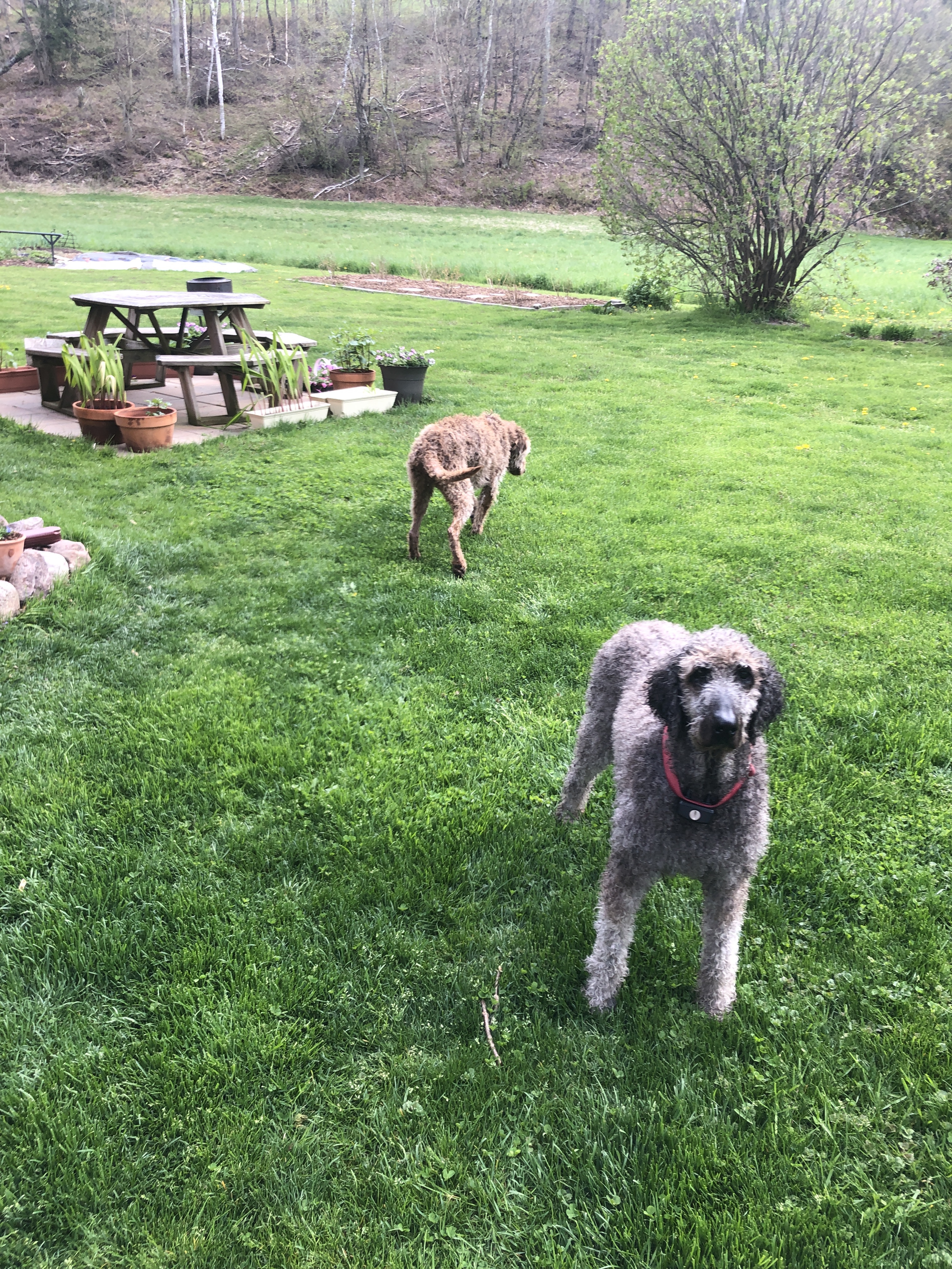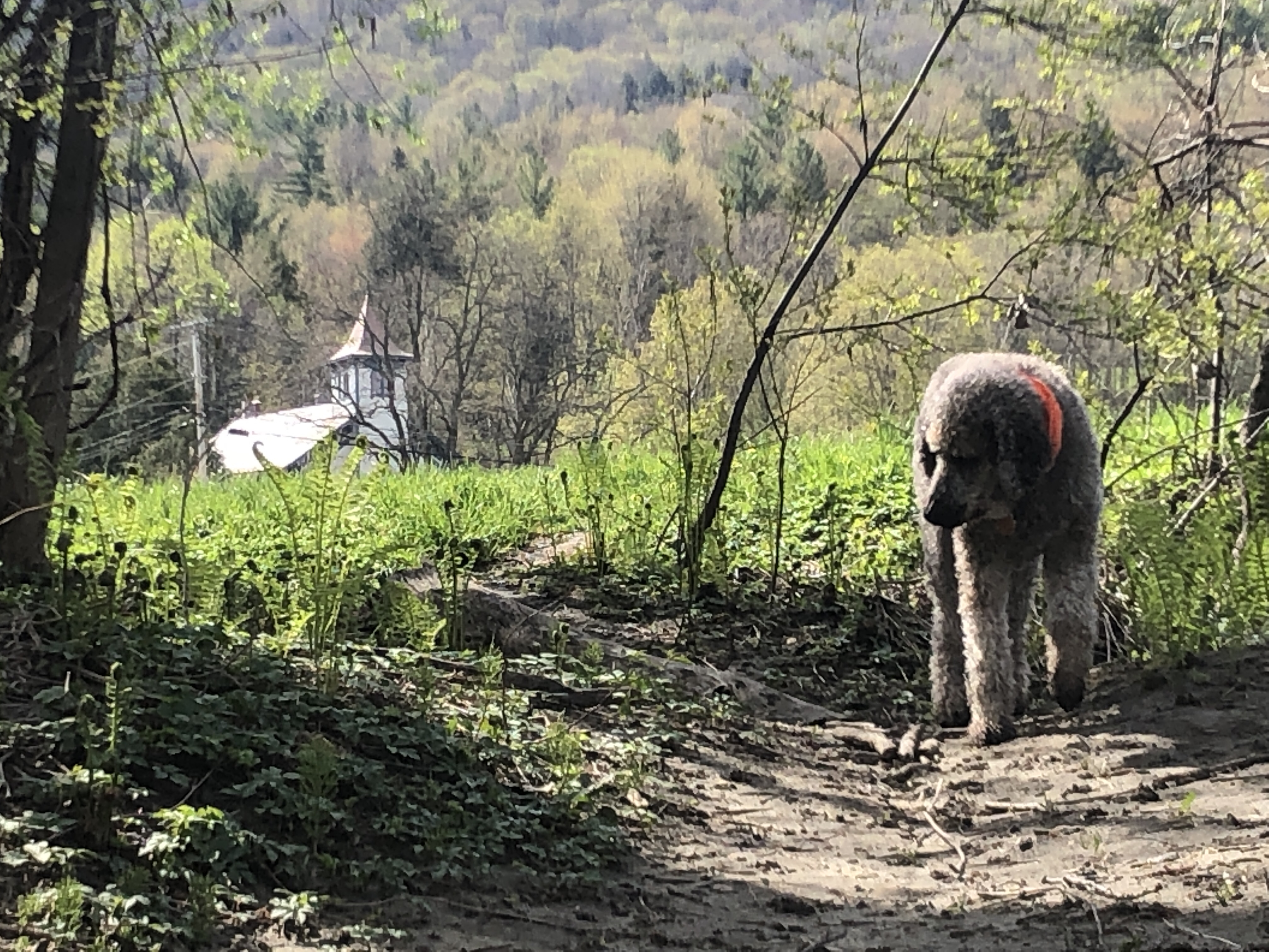 Super nice Sunday. Kind of hot and muggy… Almost hit 70. I’m not ready for that yet. Diane and I got the storm windows down downstairs and got the screens and all the windows… That helps.… Got the girls out for a walk in the field across the street. Chai was determined to get in the river…